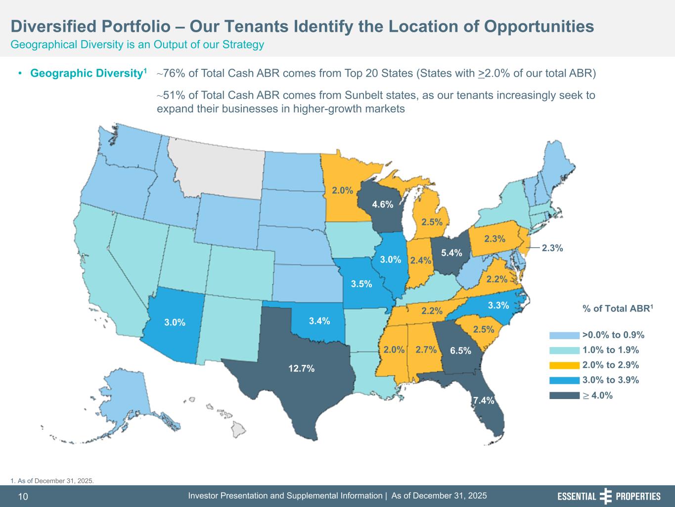 Investor Presentation and Supplemental Information | As of December 31, 202510 254, 192, 59 75, 108, 127 146, 204, 238 0, 0, 0 38, 169, 224 153, 223, 227 Diversified Portfolio – Our Tenants Identify the Location of Opportunities Geographical Diversity is an Output of our Strategy • Geographic Diversity1 ~76% of Total Cash ABR comes from Top 20 States (States with >2.0% of our total ABR) ~51% of Total Cash ABR comes from Sunbelt states, as our tenants increasingly seek to expand their businesses in higher-growth markets % of Total ABR1 >0.0% to 0.9% 1.0% to 1.9% 2.0% to 2.9% 3.0% to 3.9% ≥ 4.0% 2.3% 12.7% 3.0% 3.5% 2.0% 4.6% 2.5% 3.0% 3.4% 2.0% 5.4% 3.3% 6.5%2.7% 7.4% 2.2% 2.4% 2.5% 1. As of December 31, 2025. 2.3% 2.2%