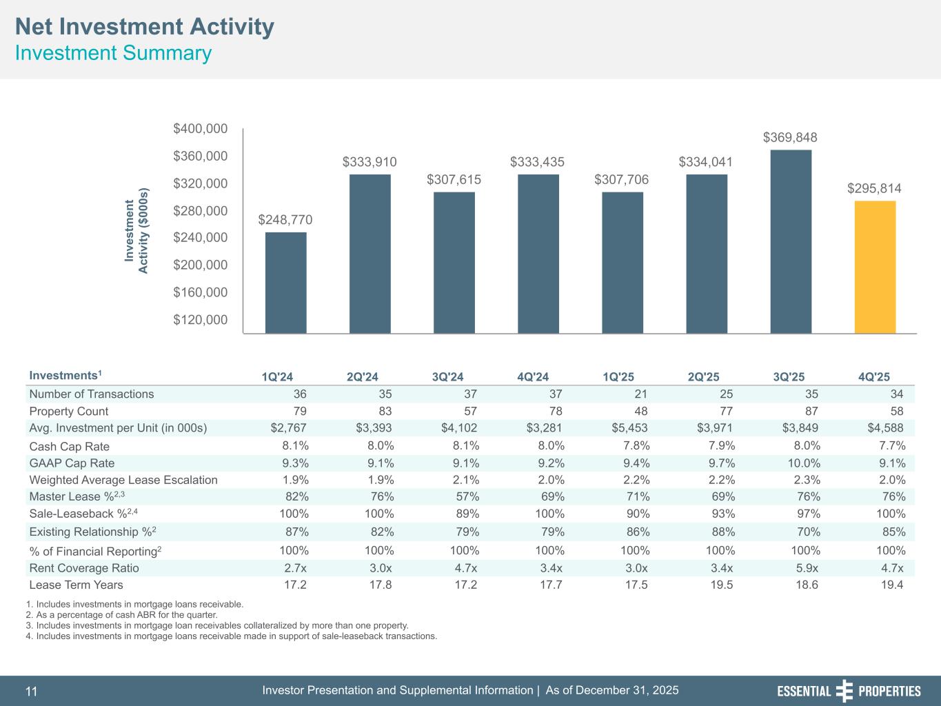 Investor Presentation and Supplemental Information | As of December 31, 202511 254, 192, 59 75, 108, 127 146, 204, 238 0, 0, 0 38, 169, 224 153, 223, 227 Net Investment Activity Investment Summary 242, 242, 242 1. Includes investments in mortgage loans receivable. 2. As a percentage of cash ABR for the quarter. 3. Includes investments in mortgage loan receivables collateralized by more than one property. 4. Includes investments in mortgage loans receivable made in support of sale-leaseback transactions. Investments1 1Q'24 2Q'24 3Q'24 4Q'24 1Q'25 2Q'25 3Q'25 4Q'25 Number of Transactions 36 35 37 37 21 25 35 34 Property Count 79 83 57 78 48 77 87 58 Avg. Investment per Unit (in 000s) $2,767 $3,393 $4,102 $3,281 $5,453 $3,971 $3,849 $4,588 Cash Cap Rate 8.1 % 8.0 % 8.1 % 8.0 % 7.8 % 7.9 % 8.0 % 7.7 % GAAP Cap Rate 9.3 % 9.1 % 9.1 % 9.2 % 9.4 % 9.7 % 10.0 % 9.1 % Weighted Average Lease Escalation 1.9 % 1.8 % 1.9 % 1.8 % 2.1 % 1.8 % 2.0 % 2.2 % 2.2 % 2.3 % 2.0 % Master Lease %2,3 82 % 76 % 57 % 69 % 71 % 69 % 76 % 76 % Sale-Leaseback %2,4 100 % 100 % 89 % 100 % 90 % 93 % 97 % 100 % Existing Relationship %2 87 % 82 % 79 % 79 % 86 % 88 % 70 % 85 % % of Financial Reporting2 100 % 100 % 100 % 100 % 100 % 100 % 100 % 100 % Rent Coverage Ratio 2.7x 3.0x 4.7x 3.4x 3.0x 3.4x 5.9x 4.7x Lease Term Years 17.2 17.8 17.2 17.7 17.5 19.5 18.6 19.4 $248,770 $333,910 $307,615 $333,435 $307,706 $334,041 $369,848 $295,814 $120,000 $160,000 $200,000 $240,000 $280,000 $320,000 $360,000 $400,000 In ve st m en t A ct iv ity ($ 00 0s )