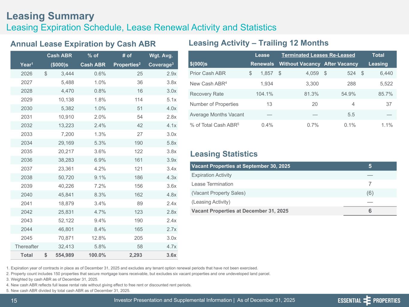 Investor Presentation and Supplemental Information | As of December 31, 202515 254, 192, 59 75, 108, 127 146, 204, 238 0, 0, 0 38, 169, 224 153, 223, 227 Leasing Summary Leasing Expiration Schedule, Lease Renewal Activity and Statistics 242, 242, 242 1. Expiration year of contracts in place as of December 31, 2025 and excludes any tenant option renewal periods that have not been exercised. 2. Property count includes 150 properties that secure mortgage loans receivable, but excludes six vacant properties and one undeveloped land parcel. 3. Weighted by cash ABR as of December 31, 2025. 4. New cash ABR reflects full lease rental rate without giving effect to free rent or discounted rent periods. 5. New cash ABR divided by total cash ABR as of December 31, 2025. Annual Lease Expiration by Cash ABR Leasing Activity – Trailing 12 Months Leasing Statistics Lease Terminated Leases Re-Leased Total $(000)s Renewals Without Vacancy After Vacancy Leasing Prior Cash ABR $ 1,857 $ 4,059 $ 524 $ 6,440 New Cash ABR4 1,934 3,300 288 5,522 Recovery Rate 104.1 % 81.3 % 54.9 % 85.7 % Number of Properties 13 20 4 37 Average Months Vacant — — 5.5 — % of Total Cash ABR5 0.4 % 0.7 % 0.1 % 1.1 % Vacant Properties at September 30, 2025 5 Expiration Activity — Lease Termination 7 (Vacant Property Sales) (6) (Leasing Activity) — Vacant Properties at December 31, 2025 6 Cash ABR % of # of Wgt. Avg. Year1 ($000)s Cash ABR Properties2 Coverage3 2026 $ 3,444 0.6 % 25 2.9x 2027 5,488 1.0 % 36 3.8x 2028 4,470 0.8 % 16 3.0x 2029 10,138 1.8 % 114 5.1x 2030 5,382 1.0 % 51 4.0x 2031 10,910 2.0 % 54 2.8x 2032 13,223 2.4 % 42 4.1x 2033 7,200 1.3 % 27 3.0x 2034 29,169 5.3 % 190 5.8x 2035 20,217 3.6 % 122 3.8x 2036 38,283 6.9 % 161 3.9x 2037 23,361 4.2 % 121 3.4x 2038 50,720 9.1 % 186 4.3x 2039 40,226 7.2 % 156 3.6x 2040 45,841 8.3 % 162 4.8x 2041 18,879 3.4 % 89 2.4x 2042 25,831 4.7 % 123 2.8x 2043 52,122 9.4 % 190 2.4x 2044 46,801 8.4 % 165 2.7x 2045 70,871 12.8 % 205 3.0x Thereafter 32,413 5.8 % 58 4.7x Total $ 554,989 100.0 % 2,293 3.6x