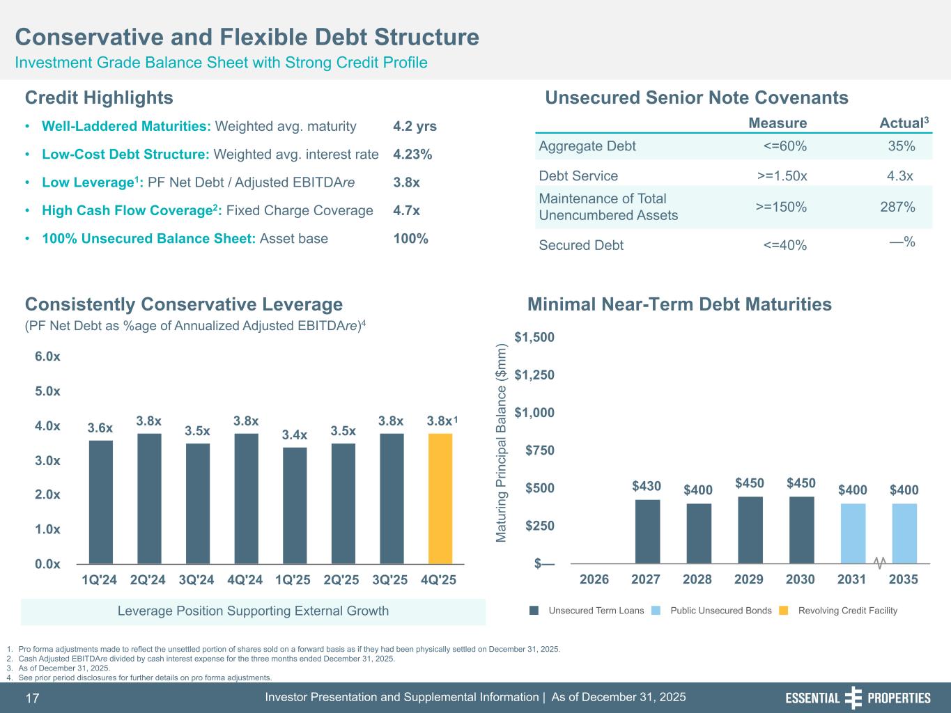 Investor Presentation and Supplemental Information | As of December 31, 202517 254, 192, 59 75, 108, 127 146, 204, 238 0, 0, 0 38, 169, 224 153, 223, 227 M at ur in g P rin ci pa l B al an ce ($ m m ) $430 $400 $450 $450 $400 $400 Unsecured Term Loans Public Unsecured Bonds Revolving Credit Facility 2026 2027 2028 2029 2030 2031 2035 $— $250 $500 $750 $1,000 $1,250 $1,500 3.6x 3.8x 3.5x 3.8x 3.4x 3.5x 3.8x 3.8x 1Q'24 2Q'24 3Q'24 4Q'24 1Q'25 2Q'25 3Q'25 4Q'25 0.0x 1.0x 2.0x 3.0x 4.0x 5.0x 6.0x Conservative and Flexible Debt Structure Investment Grade Balance Sheet with Strong Credit Profile 242, 242, 242 1. Pro forma adjustments made to reflect the unsettled portion of shares sold on a forward basis as if they had been physically settled on December 31, 2025. 2. Cash Adjusted EBITDAre divided by cash interest expense for the three months ended December 31, 2025. 3. As of December 31, 2025. 4. See prior period disclosures for further details on pro forma adjustments. • Well-Laddered Maturities: Weighted avg. maturity 4.2 yrs • Low-Cost Debt Structure: Weighted avg. interest rate 4.23% • Low Leverage1: PF Net Debt / Adjusted EBITDAre 3.8x • High Cash Flow Coverage2: Fixed Charge Coverage 4.7x • 100% Unsecured Balance Sheet: Asset base 100% Measure Actual3 Aggregate Debt <=60% 35 % Debt Service >=1.50x 4.3x Maintenance of Total Unencumbered Assets >=150% 287 % Secured Debt <=40% — % Consistently Conservative Leverage Credit Highlights Minimal Near-Term Debt Maturities Unsecured Senior Note Covenants (PF Net Debt as %age of Annualized Adjusted EBITDAre)4 Leverage Position Supporting External Growth 1