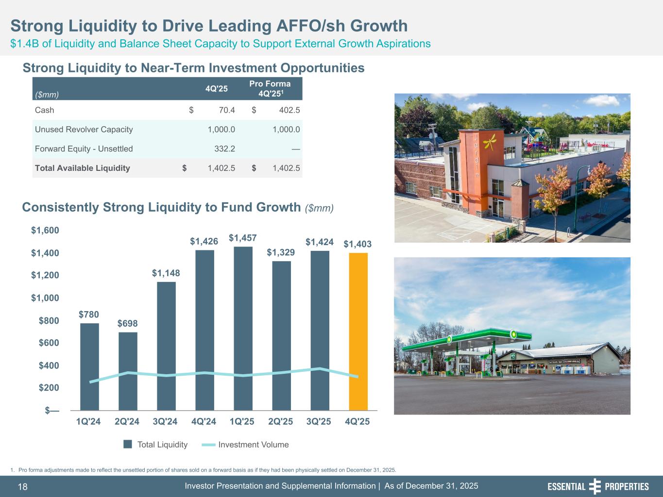 Investor Presentation and Supplemental Information | As of December 31, 202518 254, 192, 59 75, 108, 127 146, 204, 238 0, 0, 0 38, 169, 224 153, 223, 227 Consistently Strong Liquidity to Fund Growth ($mm) Strong Liquidity to Drive Leading AFFO/sh Growth $1.4B of Liquidity and Balance Sheet Capacity to Support External Growth Aspirations 242, 242, 242 ($mm) 4Q'25 Pro Forma 4Q'251 Cash $ 70.4 $ 402.5 Unused Revolver Capacity 1,000.0 1,000.0 Forward Equity - Unsettled 332.2 — Total Available Liquidity $ 1,402.5 $ 1,402.5 1. Pro forma adjustments made to reflect the unsettled portion of shares sold on a forward basis as if they had been physically settled on December 31, 2025. Strong Liquidity to Near-Term Investment Opportunities $780 $698 $1,148 $1,426 $1,457 $1,329 $1,424 $1,403 Total Liquidity Investment Volume 1Q'24 2Q'24 3Q'24 4Q'24 1Q'25 2Q'25 3Q'25 4Q'25 $— $200 $400 $600 $800 $1,000 $1,200 $1,400 $1,600