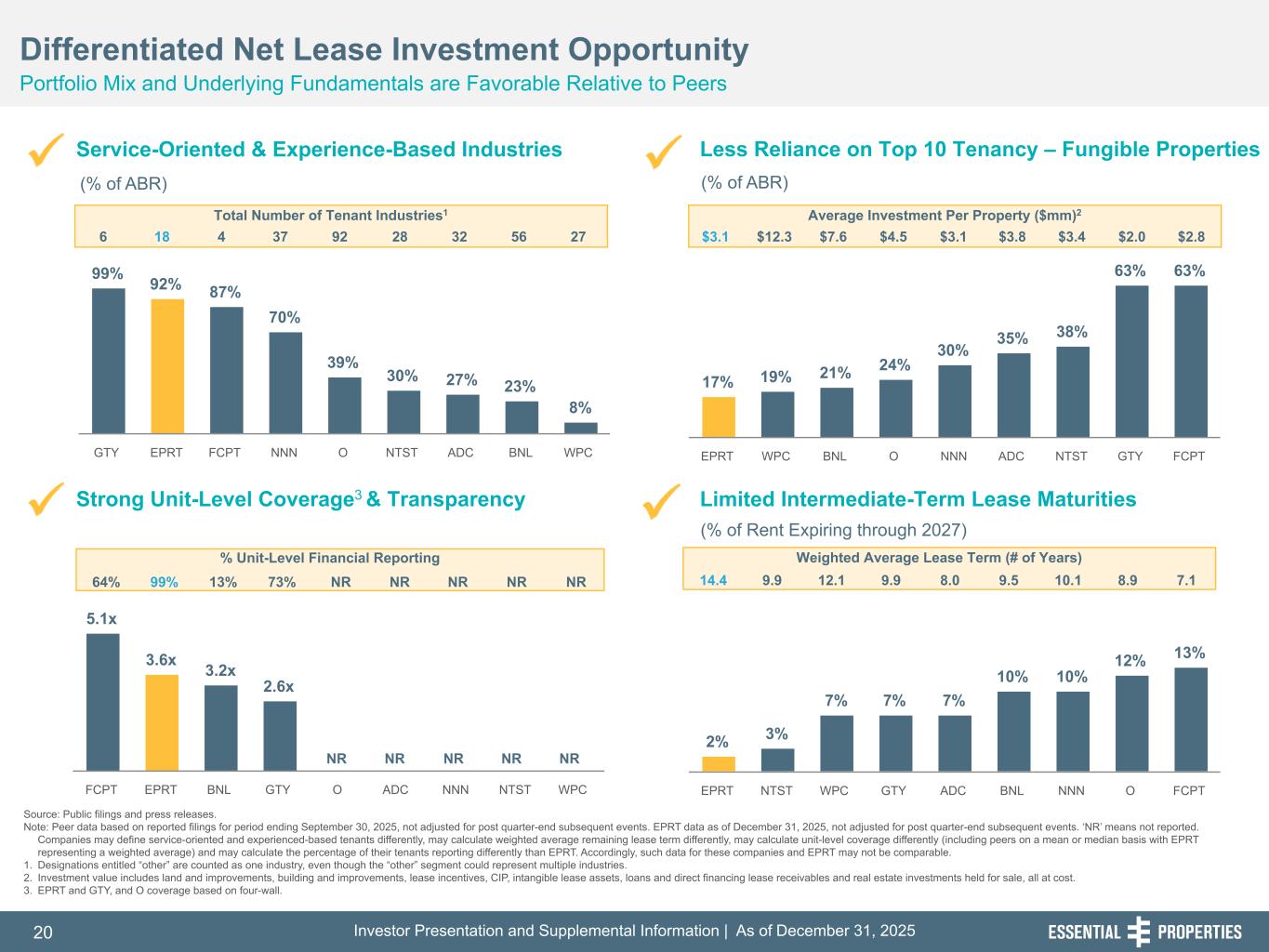 Investor Presentation and Supplemental Information | As of December 31, 202520 254, 192, 59 75, 108, 127 146, 204, 238 0, 0, 0 38, 169, 224 153, 223, 227 Source: Public filings and press releases. Note: Peer data based on reported filings for period ending September 30, 2025, not adjusted for post quarter-end subsequent events. EPRT data as of December 31, 2025, not adjusted for post quarter-end subsequent events. ‘NR’ means not reported. Companies may define service-oriented and experienced-based tenants differently, may calculate weighted average remaining lease term differently, may calculate unit-level coverage differently (including peers on a mean or median basis with EPRT representing a weighted average) and may calculate the percentage of their tenants reporting differently than EPRT. Accordingly, such data for these companies and EPRT may not be comparable. 1. Designations entitled “other” are counted as one industry, even though the “other” segment could represent multiple industries. 2. Investment value includes land and improvements, building and improvements, lease incentives, CIP, intangible lease assets, loans and direct financing lease receivables and real estate investments held for sale, all at cost. 3. EPRT and GTY, and O coverage based on four-wall. Differentiated Net Lease Investment Opportunity Portfolio Mix and Underlying Fundamentals are Favorable Relative to Peers Strong Unit-Level Coverage3 & Transparency Service-Oriented & Experience-Based Industries Limited Intermediate-Term Lease Maturities 242, 242, 242 (% of ABR) (% of Rent Expiring through 2027) Less Reliance on Top 10 Tenancy – Fungible Properties (% of ABR) 17% 19% 21% 24% 30% 35% 38% 63% 63% EPRT WPC BNL O NNN ADC NTST GTY FCPT 99% 92% 87% 70% 39% 30% 27% 23% 8% GTY EPRT FCPT NNN O NTST ADC BNL WPC 5.1x 3.6x 3.2x 2.6x FCPT EPRT BNL GTY O ADC NNN NTST WPC Total Number of Tenant Industries1 % Unit-Level Financial Reporting Average Investment Per Property ($mm)2 Weighted Average Lease Term (# of Years) NR NR NR NR 2% 3% 7% 7% 7% 10% 10% 12% 13% EPRT NTST WPC GTY ADC BNL NNN O FCPT 6 18 4 37 92 28 32 56 27 $3.1 $12.3 $7.6 $4.5 $3.1 $3.8 $3.4 $2.0 $2.8 64% 99% 13% 73% NR NR NR NR NR 14.4 9.9 12.1 9.9 8.0 9.5 10.1 8.9 7.1 NR