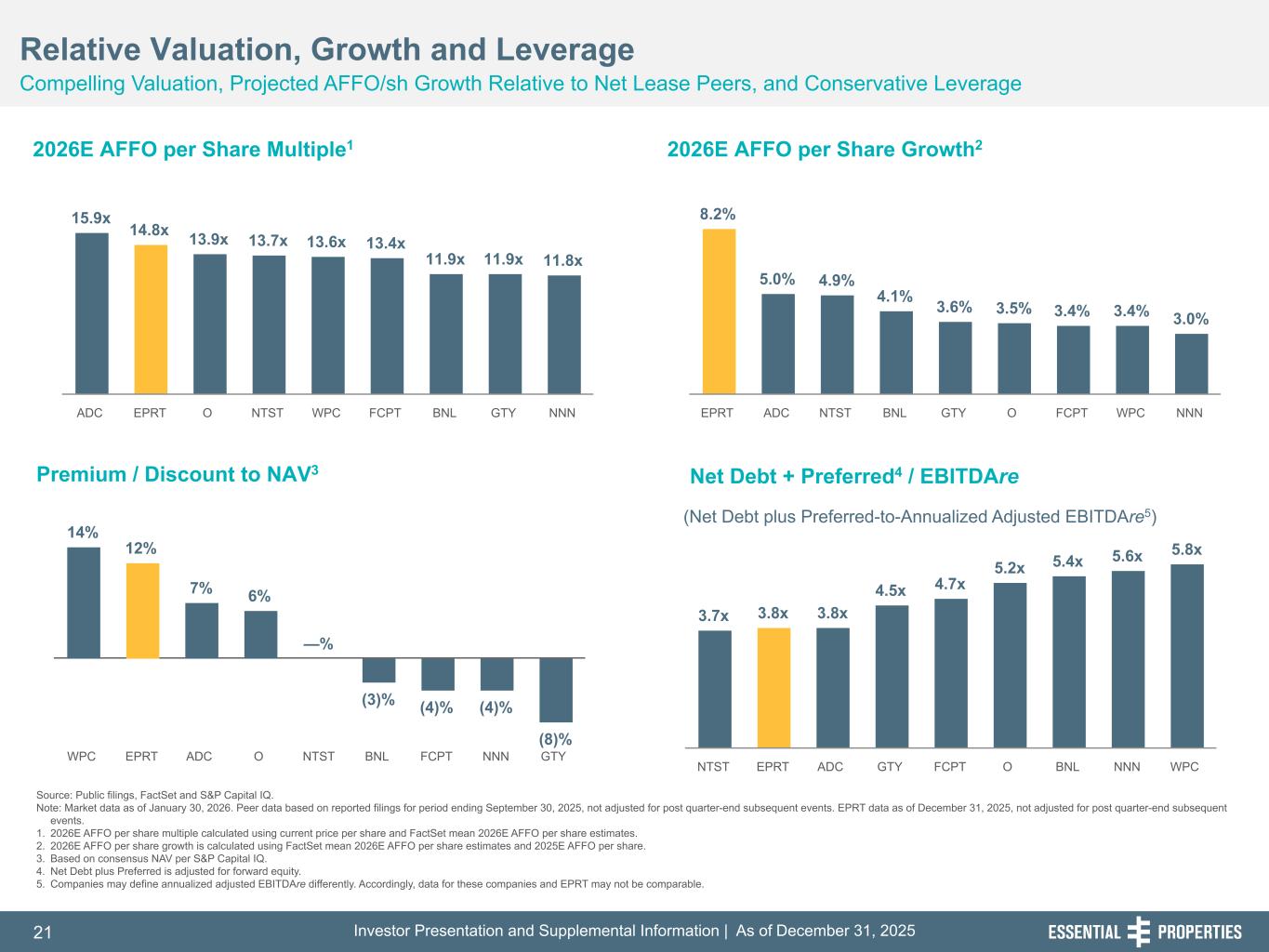 Investor Presentation and Supplemental Information | As of December 31, 202521 254, 192, 59 75, 108, 127 146, 204, 238 0, 0, 0 38, 169, 224 153, 223, 227 Source: Public filings, FactSet and S&P Capital IQ. Note: Market data as of January 30, 2026. Peer data based on reported filings for period ending September 30, 2025, not adjusted for post quarter-end subsequent events. EPRT data as of December 31, 2025, not adjusted for post quarter-end subsequent events. 1. 2026E AFFO per share multiple calculated using current price per share and FactSet mean 2026E AFFO per share estimates. 2. 2026E AFFO per share growth is calculated using FactSet mean 2026E AFFO per share estimates and 2025E AFFO per share. 3. Based on consensus NAV per S&P Capital IQ. 4. Net Debt plus Preferred is adjusted for forward equity. 5. Companies may define annualized adjusted EBITDAre differently. Accordingly, data for these companies and EPRT may not be comparable. 3.7x 3.8x 3.8x 4.5x 4.7x 5.2x 5.4x 5.6x 5.8x NTST EPRT ADC GTY FCPT O BNL NNN WPC 2026E AFFO per Share Multiple1 2026E AFFO per Share Growth2 242, 242, 242 Relative Valuation, Growth and Leverage Compelling Valuation, Projected AFFO/sh Growth Relative to Net Lease Peers, and Conservative Leverage Net Debt + Preferred4 / EBITDAre (Net Debt plus Preferred-to-Annualized Adjusted EBITDAre5) 8.2% 5.0% 4.9% 4.1% 3.6% 3.5% 3.4% 3.4% 3.0% EPRT ADC NTST BNL GTY O FCPT WPC NNN 15.9x 14.8x 13.9x 13.7x 13.6x 13.4x 11.9x 11.9x 11.8x ADC EPRT O NTST WPC FCPT BNL GTY NNN Premium / Discount to NAV3 14% 12% 7% 6% —% (3)% (4)% (4)% (8)% WPC EPRT ADC O NTST BNL FCPT NNN GTY