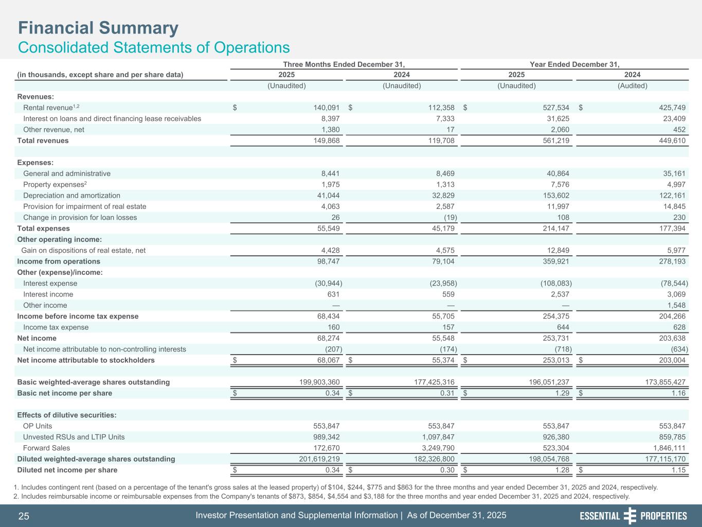 Investor Presentation and Supplemental Information | As of December 31, 202525 254, 192, 59 75, 108, 127 146, 204, 238 0, 0, 0 38, 169, 224 153, 223, 227 1. Includes contingent rent (based on a percentage of the tenant's gross sales at the leased property) of $104, $244, $775 and $863 for the three months and year ended December 31, 2025 and 2024, respectively. 2. Includes reimbursable income or reimbursable expenses from the Company's tenants of $873, $854, $4,554 and $3,188 for the three months and year ended December 31, 2025 and 2024, respectively. Three Months Ended December 31, Year Ended December 31, (in thousands, except share and per share data) 2025 2024 2025 2024 (Unaudited) (Unaudited) (Unaudited) (Audited) Revenues: Rental revenue1,2 $ 140,091 $ 112,358 $ 527,534 $ 425,749 Interest on loans and direct financing lease receivables 8,397 7,333 31,625 23,409 Other revenue, net 1,380 17 2,060 452 Total revenues 149,868 119,708 561,219 449,610 Expenses: General and administrative 8,441 8,469 40,864 35,161 Property expenses2 1,975 1,313 7,576 4,997 Depreciation and amortization 41,044 32,829 153,602 122,161 Provision for impairment of real estate 4,063 2,587 11,997 14,845 Change in provision for loan losses 26 (19) 108 230 Total expenses 55,549 45,179 214,147 177,394 Other operating income: Gain on dispositions of real estate, net 4,428 4,575 12,849 5,977 Income from operations 98,747 79,104 359,921 278,193 Other (expense)/income: Interest expense (30,944) (23,958) (108,083) (78,544) Interest income 631 559 2,537 3,069 Other income — — — 1,548 Income before income tax expense 68,434 55,705 254,375 204,266 Income tax expense 160 157 644 628 Net income 68,274 55,548 253,731 203,638 Net income attributable to non-controlling interests (207) (174) (718) (634) Net income attributable to stockholders $ 68,067 $ 55,374 $ 253,013 $ 203,004 Basic weighted-average shares outstanding 199,903,360 177,425,316 196,051,237 173,855,427 Basic net income per share $ 0.34 $ 0.31 $ 1.29 $ 1.16 Effects of dilutive securities: OP Units 553,847 553,847 553,847 553,847 Unvested RSUs and LTIP Units 989,342 1,097,847 926,380 859,785 Forward Sales 172,670 3,249,790 523,304 1,846,111 Diluted weighted-average shares outstanding 201,619,219 182,326,800 198,054,768 177,115,170 Diluted net income per share $ 0.34 $ 0.30 $ 1.28 $ 1.15 Financial Summary Consolidated Statements of Operations 242, 242, 242