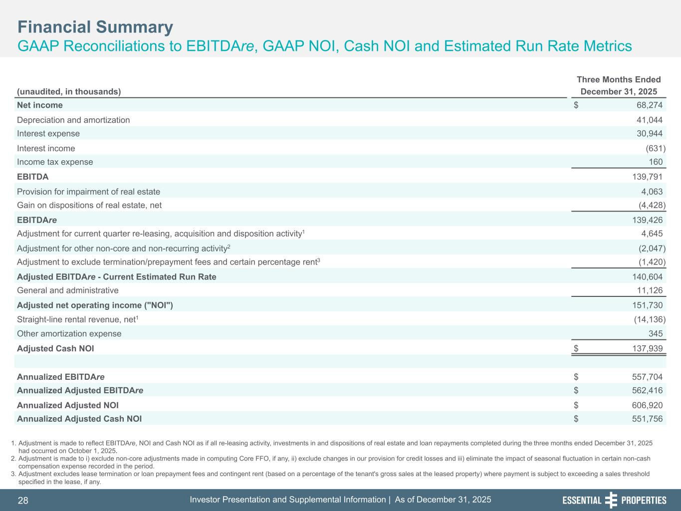 Investor Presentation and Supplemental Information | As of December 31, 202528 254, 192, 59 75, 108, 127 146, 204, 238 0, 0, 0 38, 169, 224 153, 223, 227 Financial Summary GAAP Reconciliations to EBITDAre, GAAP NOI, Cash NOI and Estimated Run Rate Metrics 242, 242, 242 1. Adjustment is made to reflect EBITDAre, NOI and Cash NOI as if all re-leasing activity, investments in and dispositions of real estate and loan repayments completed during the three months ended December 31, 2025 had occurred on October 1, 2025. 2. Adjustment is made to i) exclude non-core adjustments made in computing Core FFO, if any, ii) exclude changes in our provision for credit losses and iii) eliminate the impact of seasonal fluctuation in certain non-cash compensation expense recorded in the period. 3. Adjustment excludes lease termination or loan prepayment fees and contingent rent (based on a percentage of the tenant's gross sales at the leased property) where payment is subject to exceeding a sales threshold specified in the lease, if any. Three Months Ended (unaudited, in thousands) December 31, 2025 Net income $ 68,274 Depreciation and amortization 41,044 Interest expense 30,944 Interest income (631) Income tax expense 160 EBITDA 139,791 Provision for impairment of real estate 4,063 Gain on dispositions of real estate, net (4,428) EBITDAre 139,426 Adjustment for current quarter re-leasing, acquisition and disposition activity1 4,645 Adjustment for other non-core and non-recurring activity2 (2,047) Adjustment to exclude termination/prepayment fees and certain percentage rent3 (1,420) Adjusted EBITDAre - Current Estimated Run Rate 140,604 General and administrative 11,126 Adjusted net operating income ("NOI") 151,730 Straight-line rental revenue, net1 (14,136) Other amortization expense 345 Adjusted Cash NOI $ 137,939 Annualized EBITDAre $ 557,704 Annualized Adjusted EBITDAre $ 562,416 Annualized Adjusted NOI $ 606,920 Annualized Adjusted Cash NOI $ 551,756