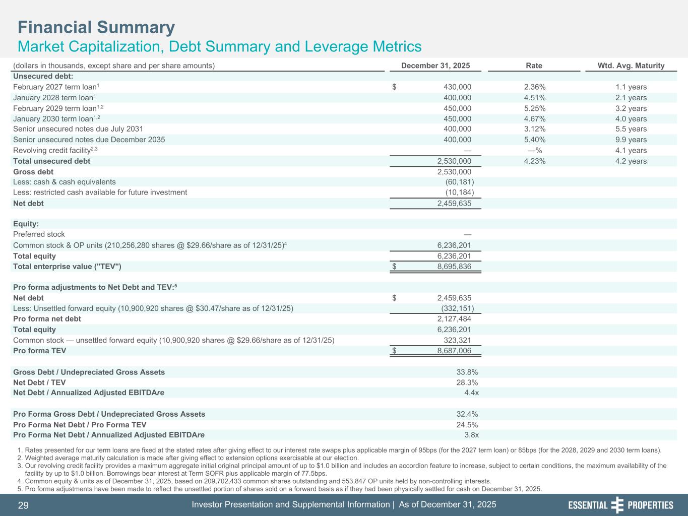 Investor Presentation and Supplemental Information | As of December 31, 202529 254, 192, 59 75, 108, 127 146, 204, 238 0, 0, 0 38, 169, 224 153, 223, 227 1. Rates presented for our term loans are fixed at the stated rates after giving effect to our interest rate swaps plus applicable margin of 95bps (for the 2027 term loan) or 85bps (for the 2028, 2029 and 2030 term loans). 2. Weighted average maturity calculation is made after giving effect to extension options exercisable at our election. 3. Our revolving credit facility provides a maximum aggregate initial original principal amount of up to $1.0 billion and includes an accordion feature to increase, subject to certain conditions, the maximum availability of the facility by up to $1.0 billion. Borrowings bear interest at Term SOFR plus applicable margin of 77.5bps. 4. Common equity & units as of December 31, 2025, based on 209,702,433 common shares outstanding and 553,847 OP units held by non-controlling interests. 5. Pro forma adjustments have been made to reflect the unsettled portion of shares sold on a forward basis as if they had been physically settled for cash on December 31, 2025. Financial Summary Market Capitalization, Debt Summary and Leverage Metrics 242, 242, 242 (dollars in thousands, except share and per share amounts) December 31, 2025 Rate Wtd. Avg. Maturity Unsecured debt: February 2027 term loan1 $ 430,000 2.36% 1.1 years January 2028 term loan1 400,000 4.51% 2.1 years February 2029 term loan1,2 450,000 5.25% 3.2 years January 2030 term loan1,2 450,000 4.67% 4.0 years Senior unsecured notes due July 2031 400,000 3.12% 5.5 years Senior unsecured notes due December 2035 400,000 5.40% 9.9 years Revolving credit facility2,3 — —% 4.1 years Total unsecured debt 2,530,000 4.23% 4.2 years Gross debt 2,530,000 Less: cash & cash equivalents (60,181) Less: restricted cash available for future investment (10,184) Net debt 2,459,635 Equity: Preferred stock — Common stock & OP units (210,256,280 shares @ $29.66/share as of 12/31/25)4 6,236,201 Total equity 6,236,201 Total enterprise value ("TEV") $ 8,695,836 Pro forma adjustments to Net Debt and TEV:5 Net debt $ 2,459,635 Less: Unsettled forward equity (10,900,920 shares @ $30.47/share as of 12/31/25) (332,151) Pro forma net debt 2,127,484 Total equity 6,236,201 Common stock — unsettled forward equity (10,900,920 shares @ $29.66/share as of 12/31/25) 323,321 Pro forma TEV $ 8,687,006 Gross Debt / Undepreciated Gross Assets 33.8% Net Debt / TEV 28.3% Net Debt / Annualized Adjusted EBITDAre 4.4x Pro Forma Gross Debt / Undepreciated Gross Assets 32.4% Pro Forma Net Debt / Pro Forma TEV 24.5% Pro Forma Net Debt / Annualized Adjusted EBITDAre 3.8x