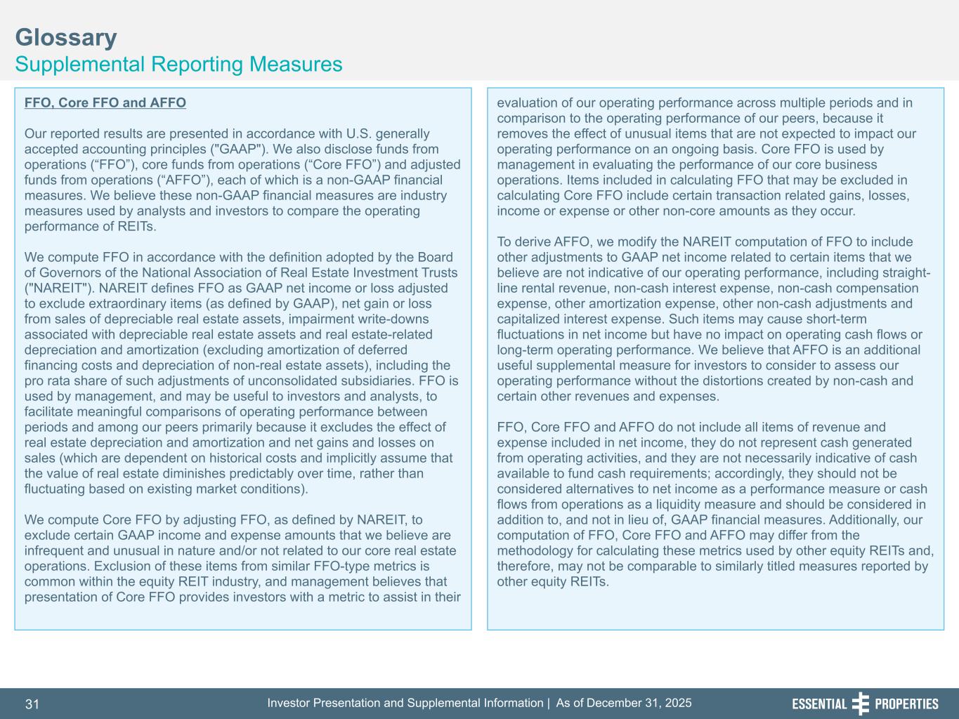 Investor Presentation and Supplemental Information | As of December 31, 202531 254, 192, 59 75, 108, 127 146, 204, 238 0, 0, 0 38, 169, 224 153, 223, 227 Glossary Supplemental Reporting Measures 242, 242, 242 FFO, Core FFO and AFFO Our reported results are presented in accordance with U.S. generally accepted accounting principles ("GAAP"). We also disclose funds from operations (“FFO”), core funds from operations (“Core FFO”) and adjusted funds from operations (“AFFO”), each of which is a non-GAAP financial measures. We believe these non-GAAP financial measures are industry measures used by analysts and investors to compare the operating performance of REITs. We compute FFO in accordance with the definition adopted by the Board of Governors of the National Association of Real Estate Investment Trusts ("NAREIT"). NAREIT defines FFO as GAAP net income or loss adjusted to exclude extraordinary items (as defined by GAAP), net gain or loss from sales of depreciable real estate assets, impairment write-downs associated with depreciable real estate assets and real estate-related depreciation and amortization (excluding amortization of deferred financing costs and depreciation of non-real estate assets), including the pro rata share of such adjustments of unconsolidated subsidiaries. FFO is used by management, and may be useful to investors and analysts, to facilitate meaningful comparisons of operating performance between periods and among our peers primarily because it excludes the effect of real estate depreciation and amortization and net gains and losses on sales (which are dependent on historical costs and implicitly assume that the value of real estate diminishes predictably over time, rather than fluctuating based on existing market conditions). We compute Core FFO by adjusting FFO, as defined by NAREIT, to exclude certain GAAP income and expense amounts that we believe are infrequent and unusual in nature and/or not related to our core real estate operations. Exclusion of these items from similar FFO-type metrics is common within the equity REIT industry, and management believes that presentation of Core FFO provides investors with a metric to assist in their evaluation of our operating performance across multiple periods and in comparison to the operating performance of our peers, because it removes the effect of unusual items that are not expected to impact our operating performance on an ongoing basis. Core FFO is used by management in evaluating the performance of our core business operations. Items included in calculating FFO that may be excluded in calculating Core FFO include certain transaction related gains, losses, income or expense or other non-core amounts as they occur. To derive AFFO, we modify the NAREIT computation of FFO to include other adjustments to GAAP net income related to certain items that we believe are not indicative of our operating performance, including straight- line rental revenue, non-cash interest expense, non-cash compensation expense, other amortization expense, other non-cash adjustments and capitalized interest expense. Such items may cause short-term fluctuations in net income but have no impact on operating cash flows or long-term operating performance. We believe that AFFO is an additional useful supplemental measure for investors to consider to assess our operating performance without the distortions created by non-cash and certain other revenues and expenses. FFO, Core FFO and AFFO do not include all items of revenue and expense included in net income, they do not represent cash generated from operating activities, and they are not necessarily indicative of cash available to fund cash requirements; accordingly, they should not be considered alternatives to net income as a performance measure or cash flows from operations as a liquidity measure and should be considered in addition to, and not in lieu of, GAAP financial measures. Additionally, our computation of FFO, Core FFO and AFFO may differ from the methodology for calculating these metrics used by other equity REITs and, therefore, may not be comparable to similarly titled measures reported by other equity REITs.