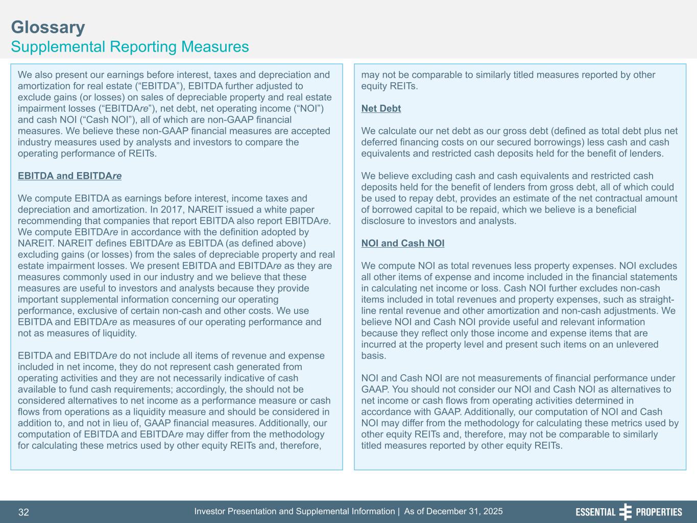 Investor Presentation and Supplemental Information | As of December 31, 202532 254, 192, 59 75, 108, 127 146, 204, 238 0, 0, 0 38, 169, 224 153, 223, 227 Glossary Supplemental Reporting Measures 242, 242, 242 We also present our earnings before interest, taxes and depreciation and amortization for real estate (“EBITDA”), EBITDA further adjusted to exclude gains (or losses) on sales of depreciable property and real estate impairment losses (“EBITDAre”), net debt, net operating income (“NOI”) and cash NOI (“Cash NOI”), all of which are non-GAAP financial measures. We believe these non-GAAP financial measures are accepted industry measures used by analysts and investors to compare the operating performance of REITs. EBITDA and EBITDAre We compute EBITDA as earnings before interest, income taxes and depreciation and amortization. In 2017, NAREIT issued a white paper recommending that companies that report EBITDA also report EBITDAre. We compute EBITDAre in accordance with the definition adopted by NAREIT. NAREIT defines EBITDAre as EBITDA (as defined above) excluding gains (or losses) from the sales of depreciable property and real estate impairment losses. We present EBITDA and EBITDAre as they are measures commonly used in our industry and we believe that these measures are useful to investors and analysts because they provide important supplemental information concerning our operating performance, exclusive of certain non-cash and other costs. We use EBITDA and EBITDAre as measures of our operating performance and not as measures of liquidity. EBITDA and EBITDAre do not include all items of revenue and expense included in net income, they do not represent cash generated from operating activities and they are not necessarily indicative of cash available to fund cash requirements; accordingly, the should not be considered alternatives to net income as a performance measure or cash flows from operations as a liquidity measure and should be considered in addition to, and not in lieu of, GAAP financial measures. Additionally, our computation of EBITDA and EBITDAre may differ from the methodology for calculating these metrics used by other equity REITs and, therefore, may not be comparable to similarly titled measures reported by other equity REITs. Net Debt We calculate our net debt as our gross debt (defined as total debt plus net deferred financing costs on our secured borrowings) less cash and cash equivalents and restricted cash deposits held for the benefit of lenders. We believe excluding cash and cash equivalents and restricted cash deposits held for the benefit of lenders from gross debt, all of which could be used to repay debt, provides an estimate of the net contractual amount of borrowed capital to be repaid, which we believe is a beneficial disclosure to investors and analysts. NOI and Cash NOI We compute NOI as total revenues less property expenses. NOI excludes all other items of expense and income included in the financial statements in calculating net income or loss. Cash NOI further excludes non-cash items included in total revenues and property expenses, such as straight- line rental revenue and other amortization and non-cash adjustments. We believe NOI and Cash NOI provide useful and relevant information because they reflect only those income and expense items that are incurred at the property level and present such items on an unlevered basis. NOI and Cash NOI are not measurements of financial performance under GAAP. You should not consider our NOI and Cash NOI as alternatives to net income or cash flows from operating activities determined in accordance with GAAP. Additionally, our computation of NOI and Cash NOI may differ from the methodology for calculating these metrics used by other equity REITs and, therefore, may not be comparable to similarly titled measures reported by other equity REITs.