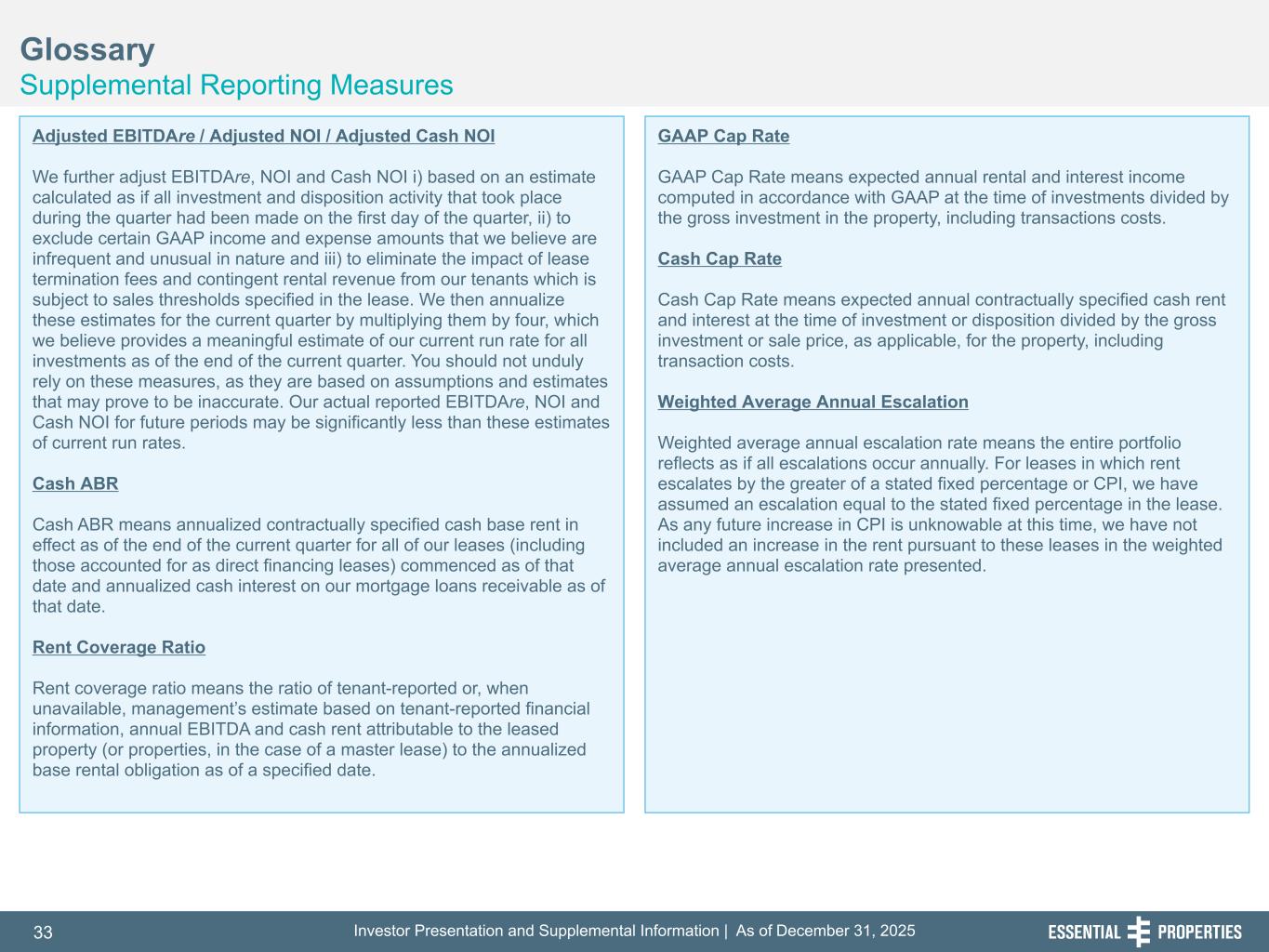 Investor Presentation and Supplemental Information | As of December 31, 202533 254, 192, 59 75, 108, 127 146, 204, 238 0, 0, 0 38, 169, 224 153, 223, 227 Glossary Supplemental Reporting Measures 242, 242, 242 Adjusted EBITDAre / Adjusted NOI / Adjusted Cash NOI We further adjust EBITDAre, NOI and Cash NOI i) based on an estimate calculated as if all investment and disposition activity that took place during the quarter had been made on the first day of the quarter, ii) to exclude certain GAAP income and expense amounts that we believe are infrequent and unusual in nature and iii) to eliminate the impact of lease termination fees and contingent rental revenue from our tenants which is subject to sales thresholds specified in the lease. We then annualize these estimates for the current quarter by multiplying them by four, which we believe provides a meaningful estimate of our current run rate for all investments as of the end of the current quarter. You should not unduly rely on these measures, as they are based on assumptions and estimates that may prove to be inaccurate. Our actual reported EBITDAre, NOI and Cash NOI for future periods may be significantly less than these estimates of current run rates. Cash ABR Cash ABR means annualized contractually specified cash base rent in effect as of the end of the current quarter for all of our leases (including those accounted for as direct financing leases) commenced as of that date and annualized cash interest on our mortgage loans receivable as of that date. Rent Coverage Ratio Rent coverage ratio means the ratio of tenant-reported or, when unavailable, management’s estimate based on tenant-reported financial information, annual EBITDA and cash rent attributable to the leased property (or properties, in the case of a master lease) to the annualized base rental obligation as of a specified date. GAAP Cap Rate GAAP Cap Rate means expected annual rental and interest income computed in accordance with GAAP at the time of investments divided by the gross investment in the property, including transactions costs. Cash Cap Rate Cash Cap Rate means expected annual contractually specified cash rent and interest at the time of investment or disposition divided by the gross investment or sale price, as applicable, for the property, including transaction costs. Weighted Average Annual Escalation Weighted average annual escalation rate means the entire portfolio reflects as if all escalations occur annually. For leases in which rent escalates by the greater of a stated fixed percentage or CPI, we have assumed an escalation equal to the stated fixed percentage in the lease. As any future increase in CPI is unknowable at this time, we have not included an increase in the rent pursuant to these leases in the weighted average annual escalation rate presented.