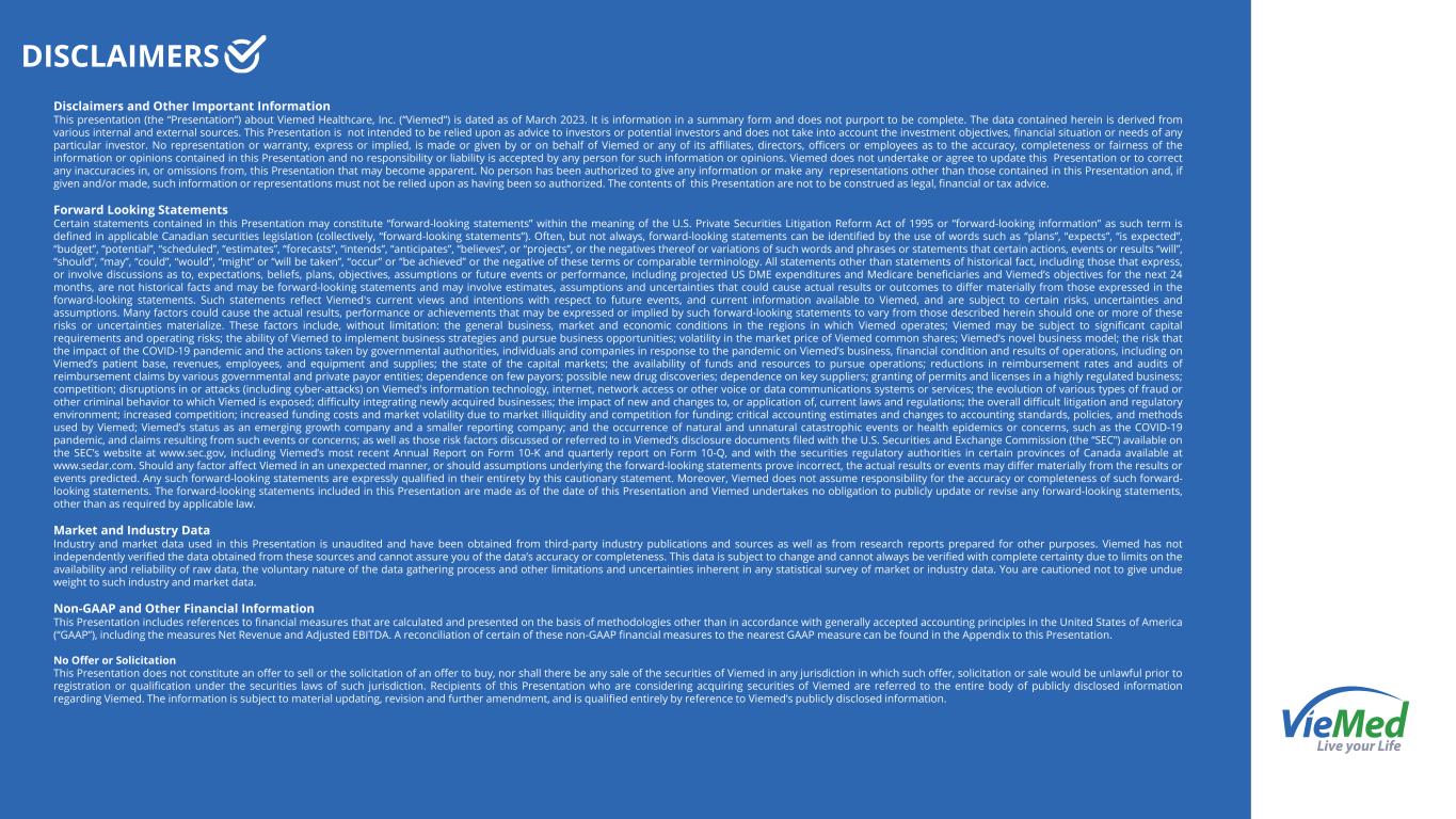 DISCLAIMERS Disclaimers and Other Important Information This presentation (the “Presentation”) about Viemed Healthcare, Inc. (“Viemed”) is dated as of March 2023. It is information in a summary form and does not purport to be complete. The data contained herein is derived from various internal and external sources. This Presentation is not intended to be relied upon as advice to investors or potential investors and does not take into account the investment objectives, financial situation or needs of any particular investor. No representation or warranty, express or implied, is made or given by or on behalf of Viemed or any of its affiliates, directors, officers or employees as to the accuracy, completeness or fairness of the information or opinions contained in this Presentation and no responsibility or liability is accepted by any person for such information or opinions. Viemed does not undertake or agree to update this Presentation or to correct any inaccuracies in, or omissions from, this Presentation that may become apparent. No person has been authorized to give any information or make any representations other than those contained in this Presentation and, if given and/or made, such information or representations must not be relied upon as having been so authorized. The contents of this Presentation are not to be construed as legal, financial or tax advice. Forward Looking Statements Certain statements contained in this Presentation may constitute “forward-looking statements” within the meaning of the U.S. Private Securities Litigation Reform Act of 1995 or “forward-looking information” as such term is defined in applicable Canadian securities legislation (collectively, “forward-looking statements”). Often, but not always, forward-looking statements can be identified by the use of words such as “plans”, “expects”, “is expected”, “budget”, “potential”, “scheduled”, “estimates”, “forecasts”, “intends”, “anticipates”, “believes”, or “projects”, or the negatives thereof or variations of such words and phrases or statements that certain actions, events or results “will”, “should”, “may”, “could”, “would”, “might” or “will be taken”, “occur” or “be achieved” or the negative of these terms or comparable terminology. All statements other than statements of historical fact, including those that express, or involve discussions as to, expectations, beliefs, plans, objectives, assumptions or future events or performance, including projected US DME expenditures and Medicare beneficiaries and Viemed’s objectives for the next 24 months, are not historical facts and may be forward-looking statements and may involve estimates, assumptions and uncertainties that could cause actual results or outcomes to differ materially from those expressed in the forward-looking statements. Such statements reflect Viemed's current views and intentions with respect to future events, and current information available to Viemed, and are subject to certain risks, uncertainties and assumptions. Many factors could cause the actual results, performance or achievements that may be expressed or implied by such forward-looking statements to vary from those described herein should one or more of these risks or uncertainties materialize. These factors include, without limitation: the general business, market and economic conditions in the regions in which Viemed operates; Viemed may be subject to significant capital requirements and operating risks; the ability of Viemed to implement business strategies and pursue business opportunities; volatility in the market price of Viemed common shares; Viemed’s novel business model; the risk that the impact of the COVID-19 pandemic and the actions taken by governmental authorities, individuals and companies in response to the pandemic on Viemed’s business, financial condition and results of operations, including on Viemed’s patient base, revenues, employees, and equipment and supplies; the state of the capital markets; the availability of funds and resources to pursue operations; reductions in reimbursement rates and audits of reimbursement claims by various governmental and private payor entities; dependence on few payors; possible new drug discoveries; dependence on key suppliers; granting of permits and licenses in a highly regulated business; competition; disruptions in or attacks (including cyber-attacks) on Viemed's information technology, internet, network access or other voice or data communications systems or services; the evolution of various types of fraud or other criminal behavior to which Viemed is exposed; difficulty integrating newly acquired businesses; the impact of new and changes to, or application of, current laws and regulations; the overall difficult litigation and regulatory environment; increased competition; increased funding costs and market volatility due to market illiquidity and competition for funding; critical accounting estimates and changes to accounting standards, policies, and methods used by Viemed; Viemed’s status as an emerging growth company and a smaller reporting company; and the occurrence of natural and unnatural catastrophic events or health epidemics or concerns, such as the COVID-19 pandemic, and claims resulting from such events or concerns; as well as those risk factors discussed or referred to in Viemed’s disclosure documents filed with the U.S. Securities and Exchange Commission (the “SEC”) available on the SEC’s website at www.sec.gov, including Viemed’s most recent Annual Report on Form 10-K and quarterly report on Form 10-Q, and with the securities regulatory authorities in certain provinces of Canada available at www.sedar.com. Should any factor affect Viemed in an unexpected manner, or should assumptions underlying the forward-looking statements prove incorrect, the actual results or events may differ materia