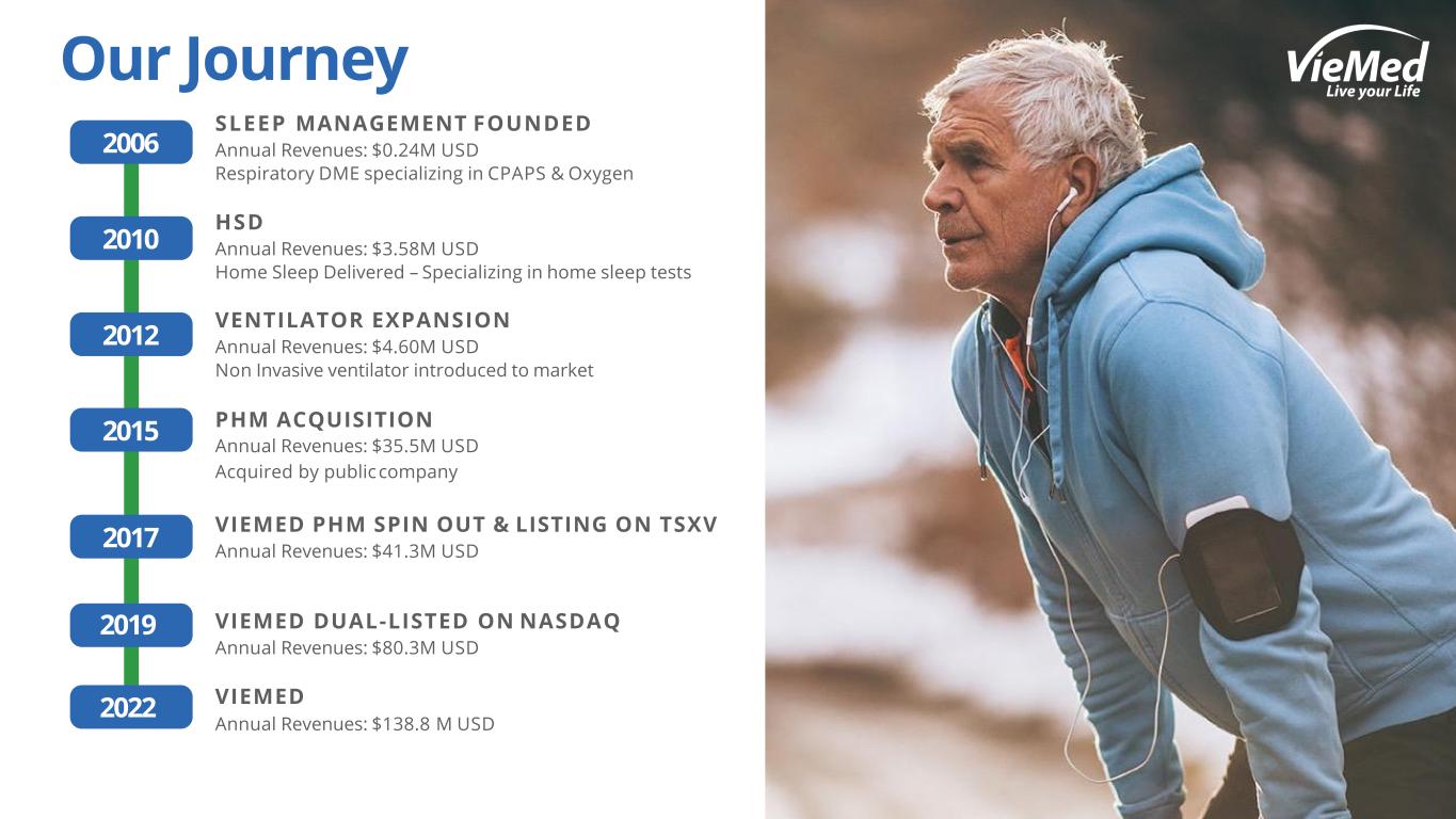 SLEEP MANAGEMENT FOUNDED Annual Revenues: $0.24M USD Respiratory DME specializing in CPAPS & Oxygen HSD Annual Revenues: $3.58M USD Home Sleep Delivered – Specializing in home sleep tests VENTILATOR EXPANSION Annual Revenues: $4.60M USD Non Invasive ventilator introduced to market PHM ACQUISITION Annual Revenues: $35.5M USD Acquired by publiccompany VIEMED PHM SPIN OUT & LISTING ON TSXV Annual Revenues: $41.3M USD VIEMED DUAL-LISTED ON NASDAQ Annual Revenues: $80.3M USD VIEMED Annual Revenues: $138.8 M USD Our Journey 2010 2012 2015 2017 2019 2022 2006