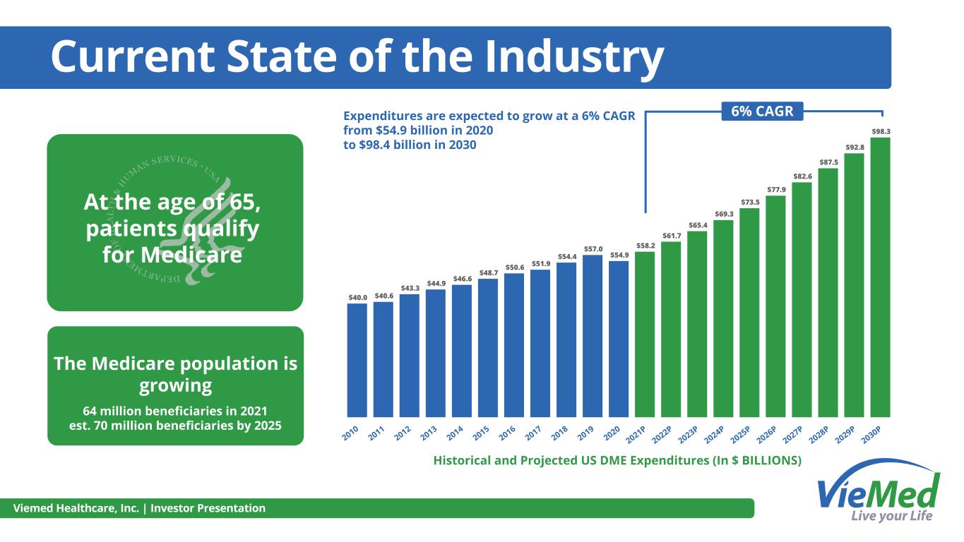 Viemed Healthcare, Inc. | Investor Presentation $40.0 $40.6 $43.3 $44.9 $46.6 $48.7 $50.6 $51.9 $54.4 $57.0 $54.9 $58.2 $61.7 $65.4 $69.3 $73.5 $77.9 $82.6 $87.5 $92.8 $98.3 Current State of the Industry The Medicare population is growing Expenditures are expected to grow at a 6% CAGR from $54.9 billion in 2020 to $98.4 billion in 2030 6% CAGR At the age of 65, patients qualify for Medicare Historical and Projected US DME Expenditures (In $ BILLIONS) 64 million beneficiaries in 2021 est. 70 million beneficiaries by 2025