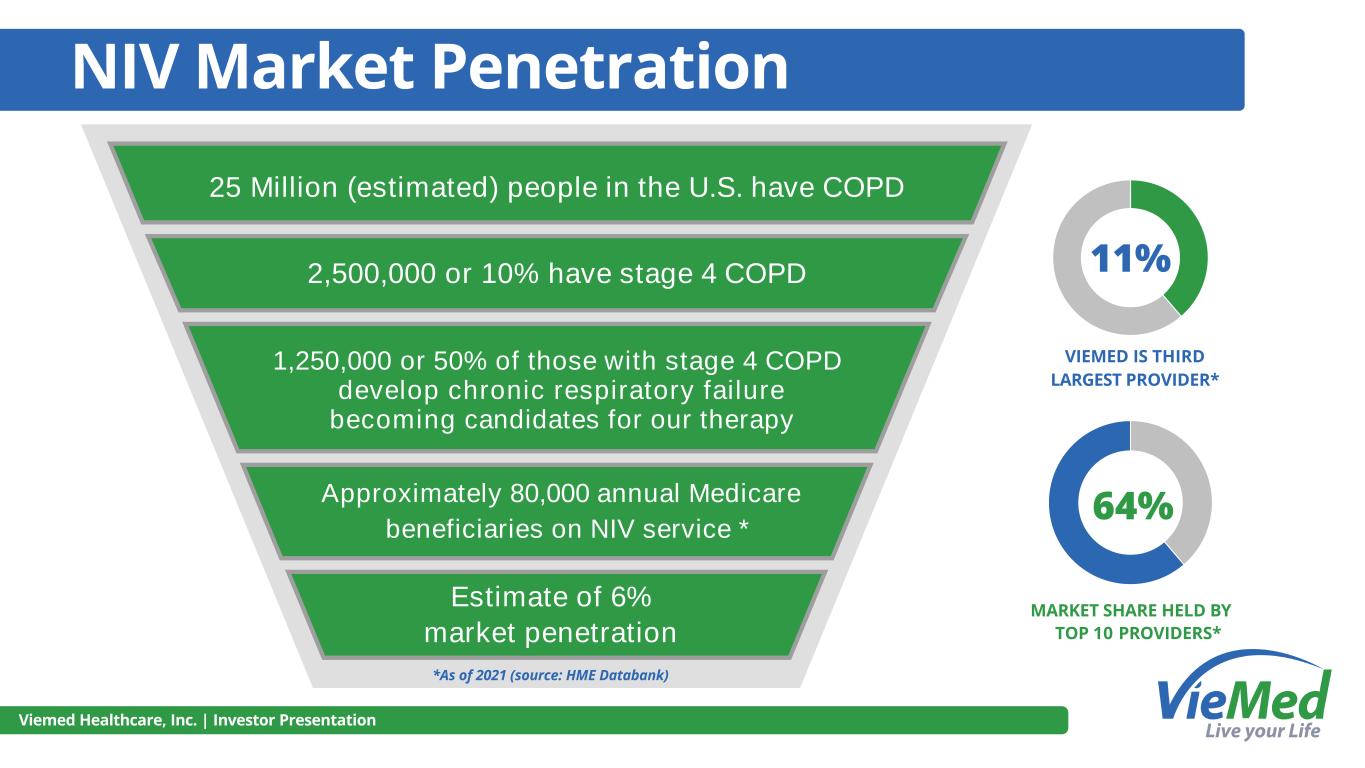 NIV Market Penetration 25 Million (estimated) people in the U.S. have COPD 2,500,000 or 10% have stage 4 COPD 1,250,000 or 50% of those with stage 4 COPD develop chronic respiratory failure becoming candidates for our therapy Approximately 80,000 annual Medicare beneficiaries on NIV service * Viemed Healthcare, Inc. | Investor Presentation Estimate of 6% market penetration *As of 2021 (source: HME Databank) 64% 11% VIEMED IS THIRD LARGEST PROVIDER* MARKET SHARE HELD BY TOP 10 PROVIDERS*