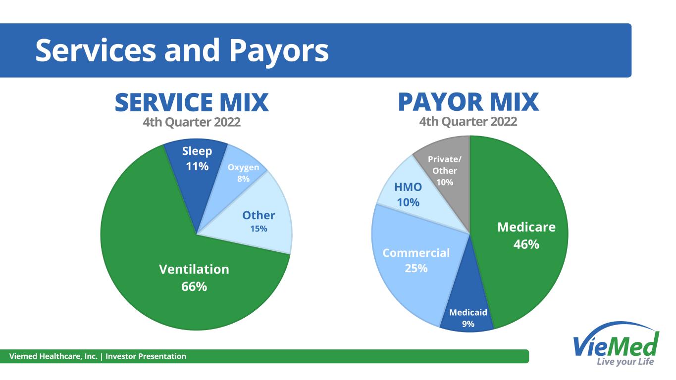 Services and Payors Viemed Healthcare, Inc. | Investor Presentation Ventilation 66% Sleep 11% Oxygen 8% Other 15% Medicare 46% Medicaid 9% Commercial 25% HMO 10% Private/ Other 10% SERVICE MIX 4th Quarter 2022 PAYOR MIX 4th Quarter 2022