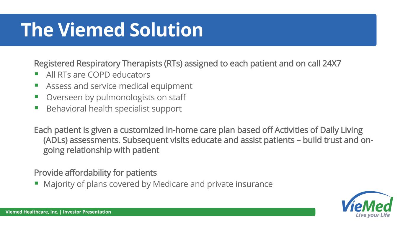 The Viemed Solution Registered Respiratory Therapists (RTs) assigned to each patient and on call 24X7 ▪ All RTs are COPD educators ▪ Assess and service medical equipment ▪ Overseen by pulmonologists on staff ▪ Behavioral health specialist support Each patient is given a customized in-home care plan based off Activities of Daily Living (ADLs) assessments. Subsequent visits educate and assist patients – build trust and on- going relationship with patient Provide affordability for patients ▪ Majority of plans covered by Medicare and private insurance Viemed Healthcare, Inc. | Investor Presentation