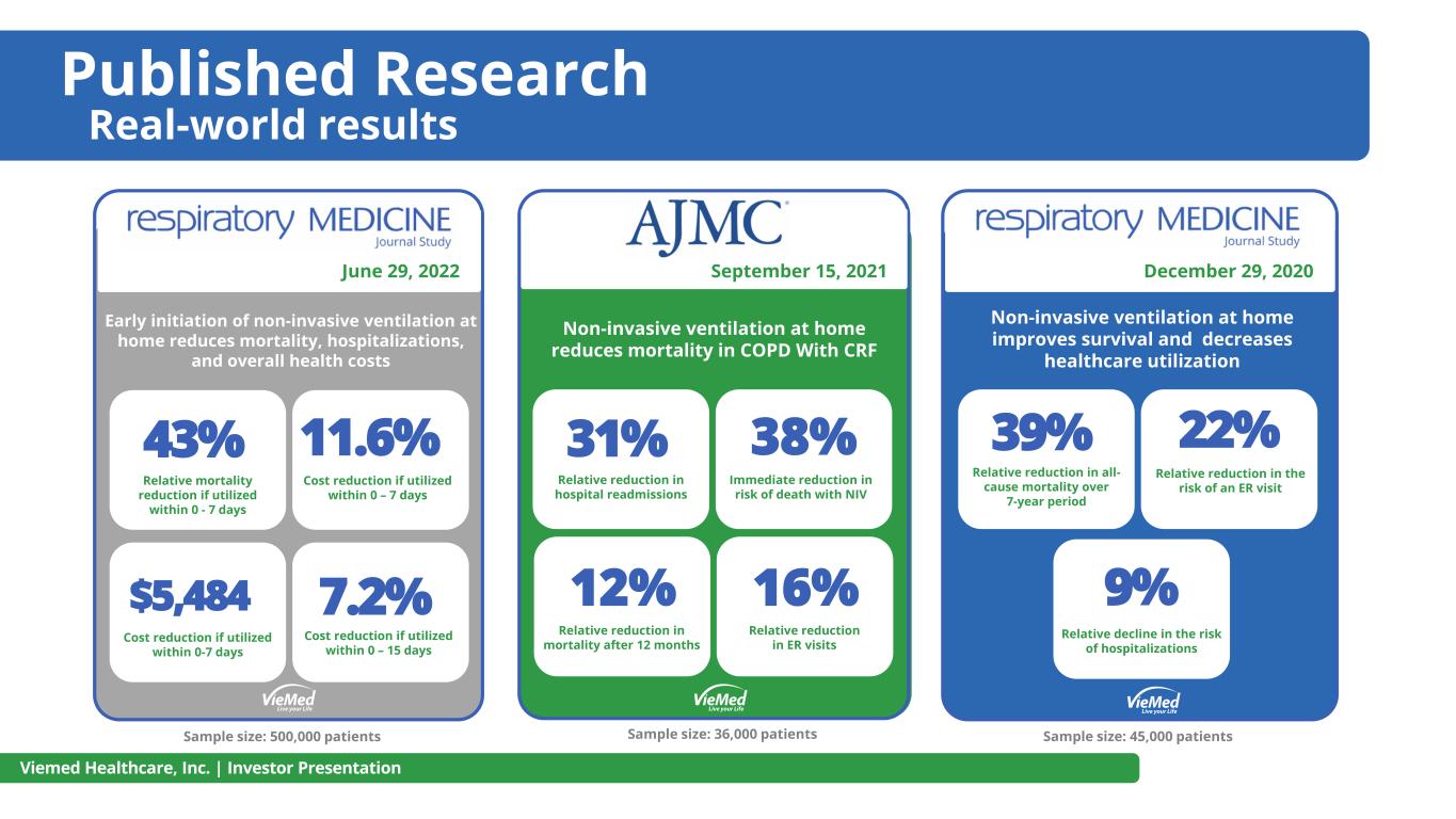 Published Research Real-world results Viemed Healthcare, Inc. | Investor Presentation 43% Relative mortality reduction if utilized within 0 - 7 days 11.6% Cost reduction if utilized within 0 – 7 days 7.2% Cost reduction if utilized within 0 – 15 days $5,484 Cost reduction if utilized within 0-7 days Early initiation of non-invasive ventilation at home reduces mortality, hospitalizations, and overall health costs 31% Relative reduction in hospital readmissions 38% Immediate reduction in risk of death with NIV 12% Relative reduction in mortality after 12 months 39% Relative reduction in all- cause mortality over 7-year period 22% 9% Relative decline in the risk of hospitalizations Non-invasive ventilation at home improves survival and decreases healthcare utilization Relative reduction in the risk of an ER visit Non-invasive ventilation at home reduces mortality in COPD With CRF September 15, 2021 December 29, 2020 June 29, 2022 Sample size: 500,000 patients Sample size: 36,000 patients Sample size: 45,000 patients 16% Relative reduction in ER visits