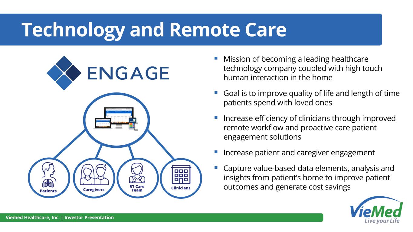 Technology and Remote Care ▪ Mission of becoming a leading healthcare technology company coupled with high touch human interaction in the home ▪ Goal is to improve quality of life and length of time patients spend with loved ones ▪ Increase efficiency of clinicians through improved remote workflow and proactive care patient engagement solutions ▪ Increase patient and caregiver engagement ▪ Capture value-based data elements, analysis and insights from patient’s home to improve patient outcomes and generate cost savings Viemed Healthcare, Inc. | Investor Presentation Clinicians Patients Caregivers RT Care Team