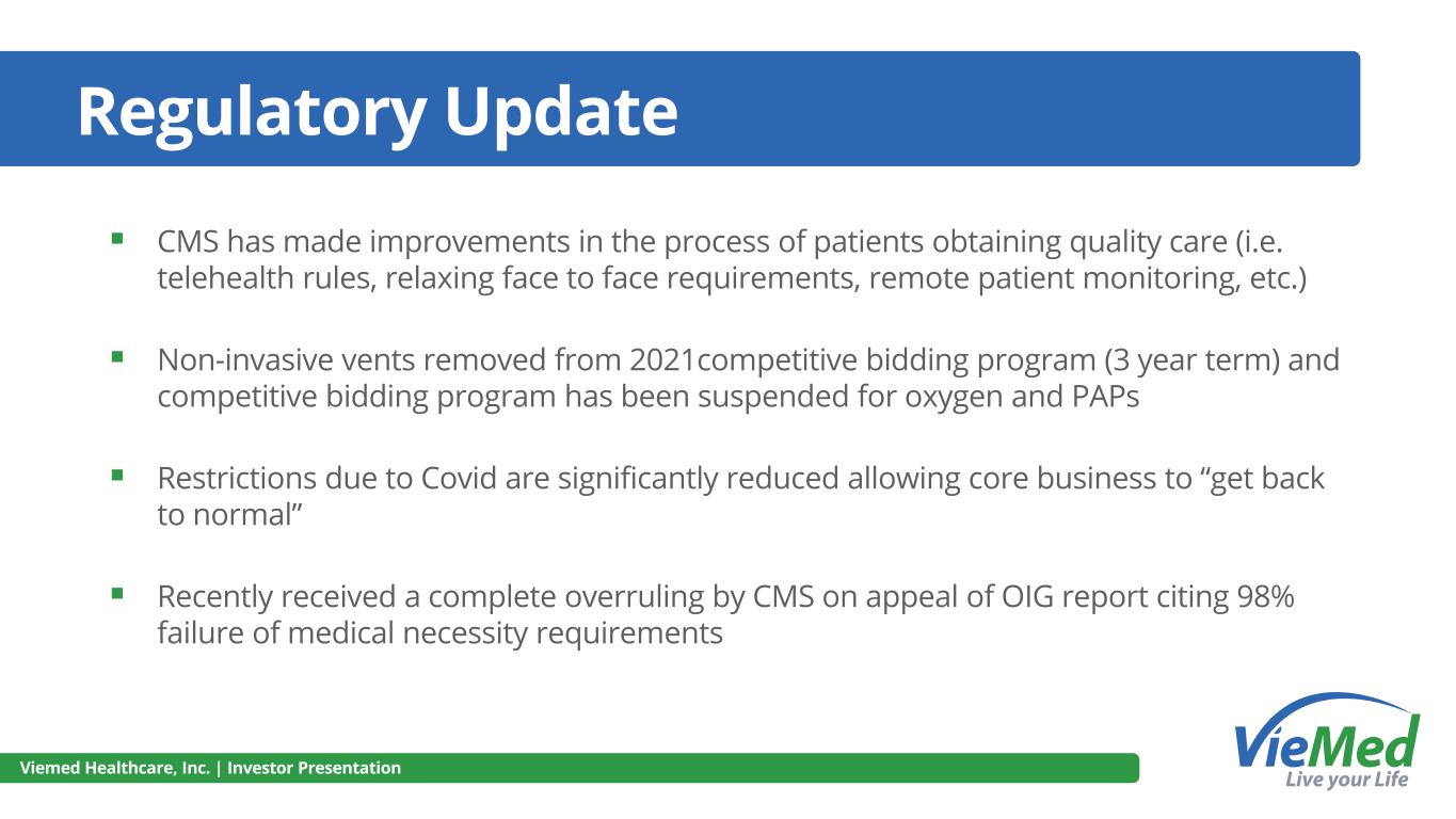 Regulatory Update ▪ CMS has made improvements in the process of patients obtaining quality care (i.e. telehealth rules, relaxing face to face requirements, remote patient monitoring, etc.) ▪ Non-invasive vents removed from 2021competitive bidding program (3 year term) and competitive bidding program has been suspended for oxygen and PAPs ▪ Restrictions due to Covid are significantly reduced allowing core business to “get back to normal” ▪ Recently received a complete overruling by CMS on appeal of OIG report citing 98% failure of medical necessity requirements Viemed Healthcare, Inc. | Investor Presentation