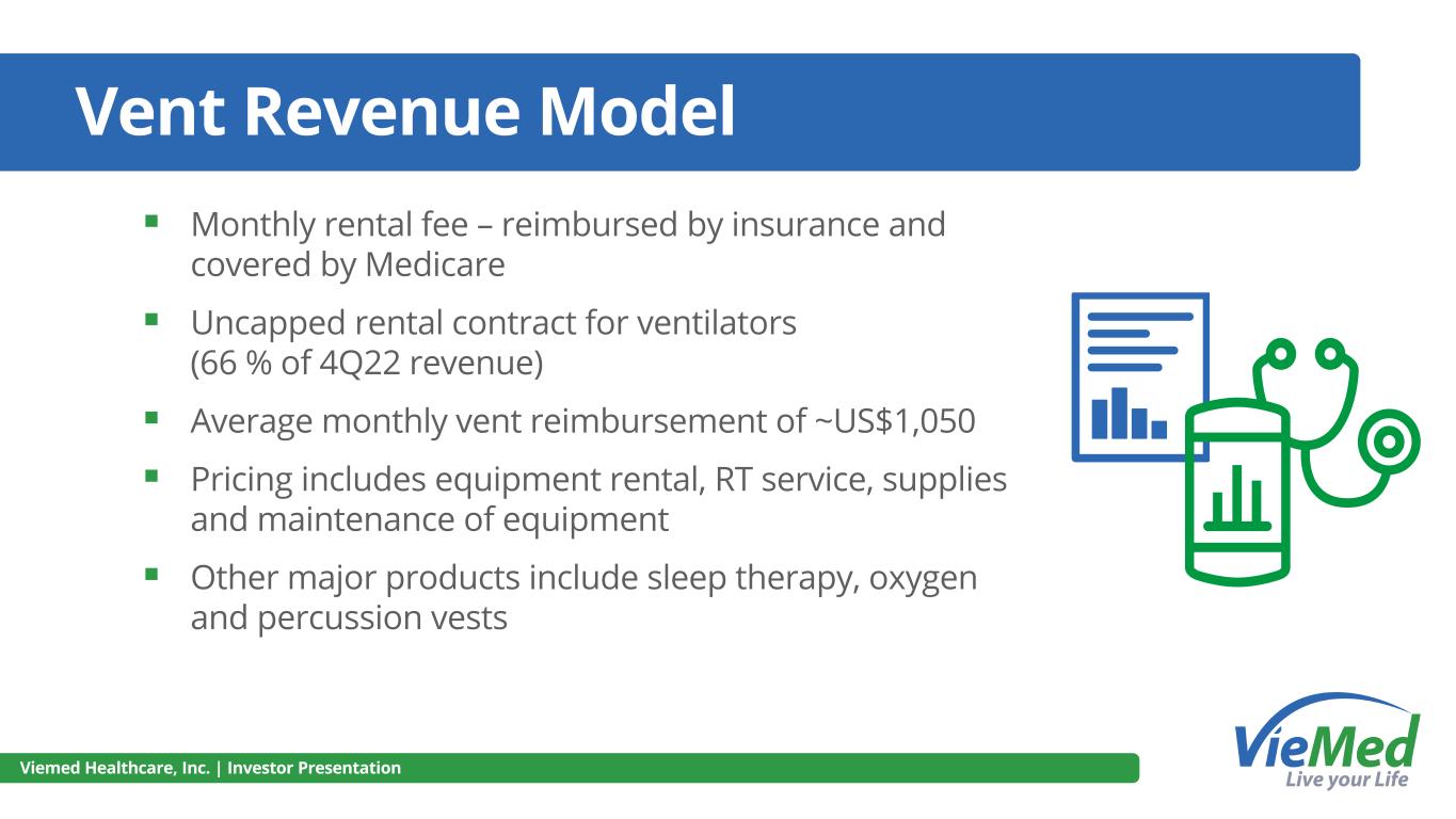 Vent Revenue Model ▪ Monthly rental fee – reimbursed by insurance and covered by Medicare ▪ Uncapped rental contract for ventilators (66 % of 4Q22 revenue) ▪ Average monthly vent reimbursement of ~US$1,050 ▪ Pricing includes equipment rental, RT service, supplies and maintenance of equipment ▪ Other major products include sleep therapy, oxygen and percussion vests Viemed Healthcare, Inc. | Investor Presentation