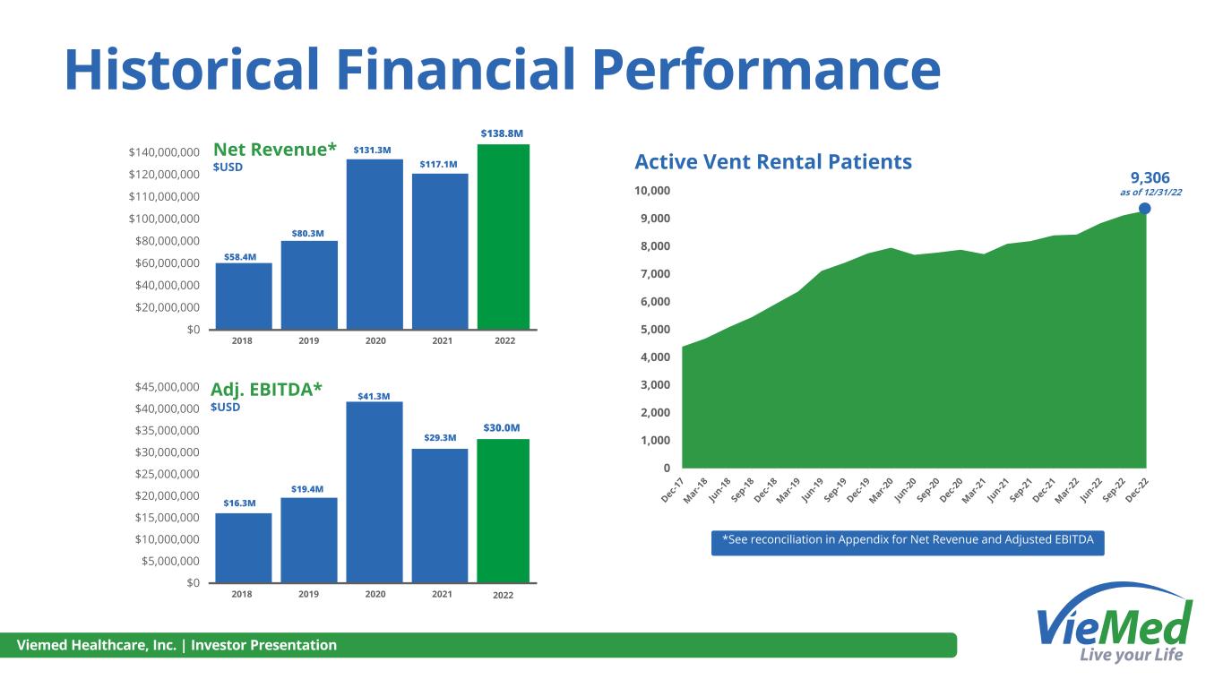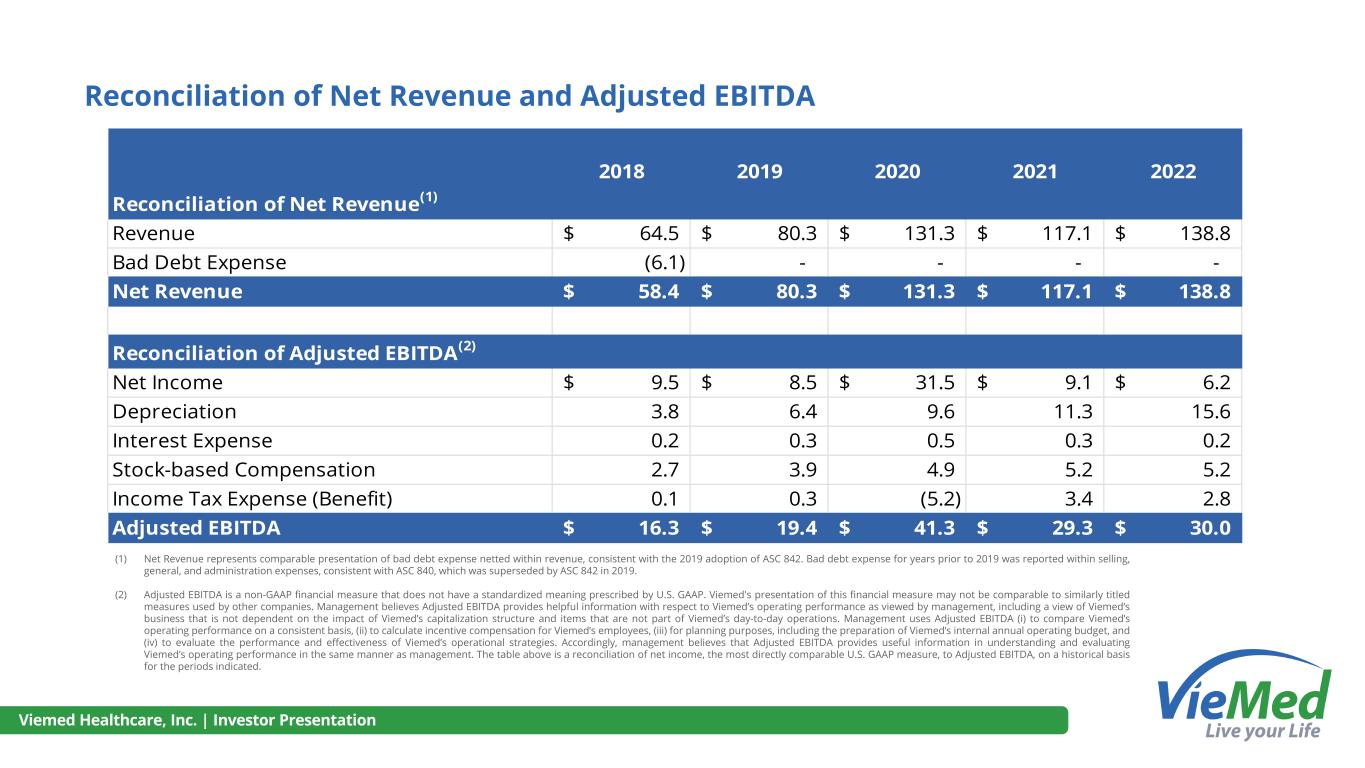 Viemed Healthcare, Inc. | Investor Presentation 2018 2019 2020 2021 2022 Reconciliation of Net Revenue(1) Revenue 64.5$ 80.3$ 131.3$ 117.1$ 138.8$ Bad Debt Expense (6.1) - - - - Net Revenue 58.4$ 80.3$ 131.3$ 117.1$ 138.8$ Reconciliation of Adjusted EBITDA(2) Net Income 9.5$ 8.5$ 31.5$ 9.1$ 6.2$ Depreciation 3.8 6.4 9.6 11.3 15.6 Interest Expense 0.2 0.3 0.5 0.3 0.2 Stock-based Compensation 2.7 3.9 4.9 5.2 5.2 Income Tax Expense (Benefit) 0.1 0.3 (5.2) 3.4 2.8 Adjusted EBITDA 16.3$ 19.4$ 41.3$ 29.3$ 30.0$ (1) Net Revenue represents comparable presentation of bad debt expense netted within revenue, consistent with the 2019 adoption of ASC 842. Bad debt expense for years prior to 2019 was reported within selling, general, and administration expenses, consistent with ASC 840, which was superseded by ASC 842 in 2019. (2) Adjusted EBITDA is a non-GAAP financial measure that does not have a standardized meaning prescribed by U.S. GAAP. Viemed's presentation of this financial measure may not be comparable to similarly titled measures used by other companies. Management believes Adjusted EBITDA provides helpful information with respect to Viemed’s operating performance as viewed by management, including a view of Viemed’s business that is not dependent on the impact of Viemed’s capitalization structure and items that are not part of Viemed’s day-to-day operations. Management uses Adjusted EBITDA (i) to compare Viemed’s operating performance on a consistent basis, (ii) to calculate incentive compensation for Viemed’s employees, (iii) for planning purposes, including the preparation of Viemed’s internal annual operating budget, and (iv) to evaluate the performance and effectiveness of Viemed’s operational strategies. Accordingly, management believes that Adjusted EBITDA provides useful information in understanding and evaluating Viemed’s operating performance in the same manner as management. The table above is a reconciliation of net income, the most directly comparable U.S. GAAP measure, to Adjusted EBITDA, on a historical basis for the periods indicated. Reconciliation of Net Revenue and Adjusted EBITDA