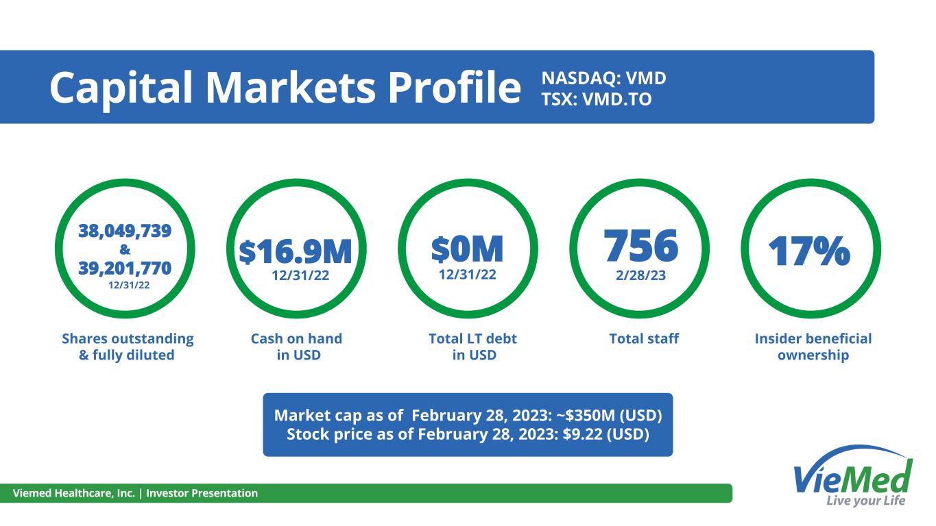 Capital Markets Profile Viemed Healthcare, Inc. | Investor Presentation 38,049,739 & 39,201,770 Shares outstanding & fully diluted $16.9M 17% Insider beneficial ownership Cash on hand in USD Total LT debt in USD $0M Total staff 756 Market cap as of February 28, 2023: ~$350M (USD) Stock price as of February 28, 2023: $9.22 (USD) NASDAQ: VMD TSX: VMD.TO 12/31/22 12/31/22 12/31/22 2/28/23