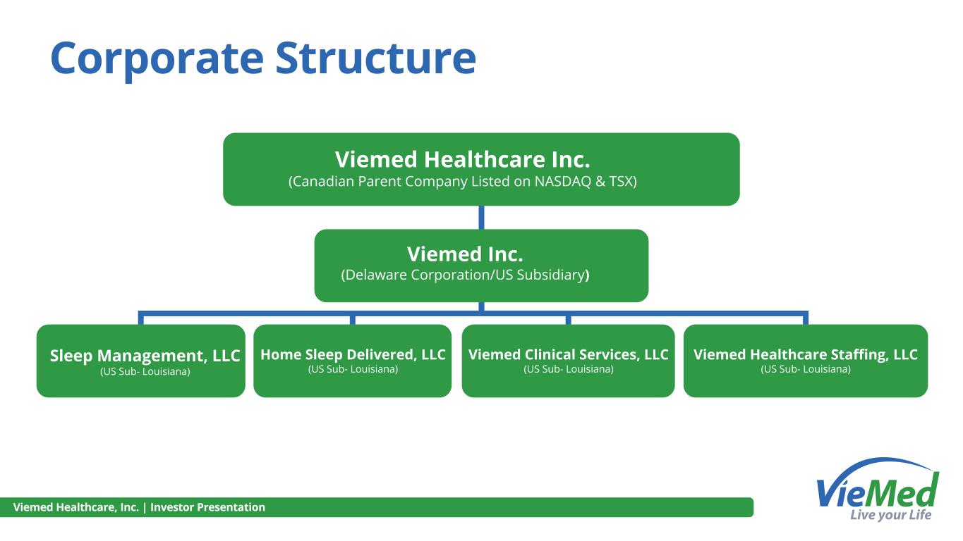 Viemed Healthcare, Inc. | Investor Presentation Corporate Structure Viemed Healthcare Inc. (Canadian Parent Company Listed on NASDAQ & TSX) Viemed Inc. (Delaware Corporation/US Subsidiary) Sleep Management, LLC (US Sub- Louisiana) Home Sleep Delivered, LLC (US Sub- Louisiana) Viemed Clinical Services, LLC (US Sub- Louisiana) Viemed Healthcare Staffing, LLC (US Sub- Louisiana)
