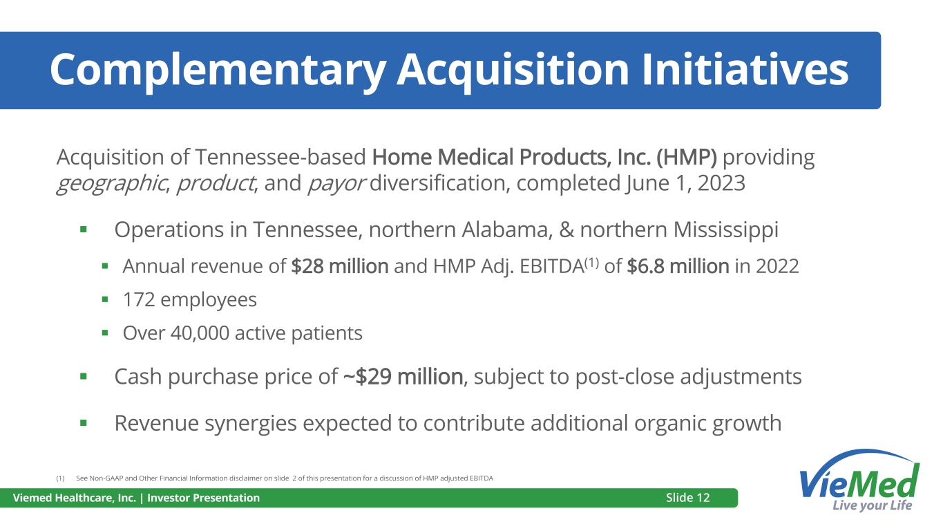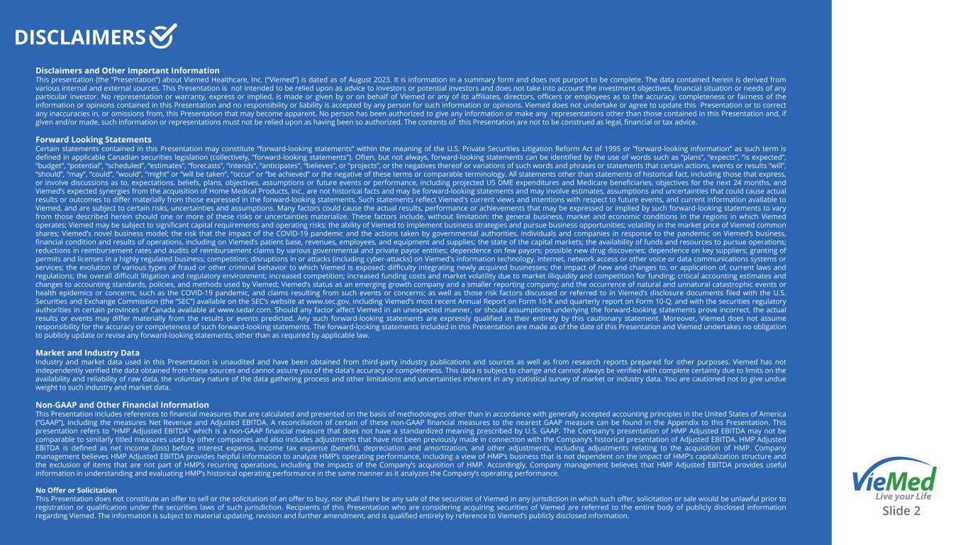 DISCLAIMERS Disclaimers and Other Important Information This presentation (the “Presentation”) about Viemed Healthcare, Inc. (“Viemed”) is dated as of August 2023. It is information in a summary form and does not purport to be complete. The data contained herein is derived from various internal and external sources. This Presentation is not intended to be relied upon as advice to investors or potential investors and does not take into account the investment objectives, financial situation or needs of any particular investor. No representation or warranty, express or implied, is made or given by or on behalf of Viemed or any of its affiliates, directors, officers or employees as to the accuracy, completeness or fairness of the information or opinions contained in this Presentation and no responsibility or liability is accepted by any person for such information or opinions. Viemed does not undertake or agree to update this Presentation or to correct any inaccuracies in, or omissions from, this Presentation that may become apparent. No person has been authorized to give any information or make any representations other than those contained in this Presentation and, if given and/or made, such information or representations must not be relied upon as having been so authorized. The contents of this Presentation are not to be construed as legal, financial or tax advice. Forward Looking Statements Certain statements contained in this Presentation may constitute “forward-looking statements” within the meaning of the U.S. Private Securities Litigation Reform Act of 1995 or “forward-looking information” as such term is defined in applicable Canadian securities legislation (collectively, “forward-looking statements”). Often, but not always, forward-looking statements can be identified by the use of words such as “plans”, “expects”, “is expected”, “budget”, “potential”, “scheduled”, “estimates”, “forecasts”, “intends”, “anticipates”, “believes”, or “projects”, or the negatives thereof or variations of such words and phrases or statements that certain actions, events or results “will”, “should”, “may”, “could”, “would”, “might” or “will be taken”, “occur” or “be achieved” or the negative of these terms or comparable terminology. All statements other than statements of historical fact, including those that express, or involve discussions as to, expectations, beliefs, plans, objectives, assumptions or future events or performance, including projected US DME expenditures and Medicare beneficiaries, objectives for the next 24 months, and Viemed’s expected synergies from the acquisition of Home Medical Products, Inc., are not historical facts and may be forward-looking statements and may involve estimates, assumptions and uncertainties that could cause actual results or outcomes to differ materially from those expressed in the forward-looking statements. Such statements reflect Viemed's current views and intentions with respect to future events, and current information available to Viemed, and are subject to certain risks, uncertainties and assumptions. Many factors could cause the actual results, performance or achievements that may be expressed or implied by such forward-looking statements to vary from those described herein should one or more of these risks or uncertainties materialize. These factors include, without limitation: the general business, market and economic conditions in the regions in which Viemed operates; Viemed may be subject to significant capital requirements and operating risks; the ability of Viemed to implement business strategies and pursue business opportunities; volatility in the market price of Viemed common shares; Viemed’s novel business model; the risk that the impact of the COVID-19 pandemic and the actions taken by governmental authorities, individuals and companies in response to the pandemic on Viemed’s business, financial condition and results of operations, including on Viemed’s patient base, revenues, employees, and equipment and supplies; the state of the capital markets; the availability of funds and resources to pursue operations; reductions in reimbursement rates and audits of reimbursement claims by various governmental and private payor entities; dependence on few payors; possible new drug discoveries; dependence on key suppliers; granting of permits and licenses in a highly regulated business; competition; disruptions in or attacks (including cyber-attacks) on Viemed's information technology, internet, network access or other voice or data communications systems or services; the evolution of various types of fraud or other criminal behavior to which Viemed is exposed; difficulty integrating newly acquired businesses; the impact of new and changes to, or application of, current laws and regulations; the overall difficult litigation and regulatory environment; increased competition; increased funding costs and market volatility due to market illiquidity and competition for funding; critical accounting estimates and changes to accounting standards, policies, and methods used by Viemed; Viemed’s status as an emerging growth company and a smaller reporting company; and the occurrence of natural and unnatural catastrophic events or health epidemics or concerns, such as the COVID-19 pandemic, and claims resulting from such events or concerns; as well as those risk factors discussed or referred to in Viemed’s disclosure documents filed with the U.S. Securities and Exchange Commission (the “SEC”) available on the SEC’s website at www.sec.gov, including Viemed’s most recent Annual Report on Form 10-K and quarterly report on Form 10-Q, and with the securities regulatory authorities in certain provinces of Canada available at www.sedar.com. Should any factor affect Viemed in an unexpected manner, or should assumptions underlying the forward-looking s