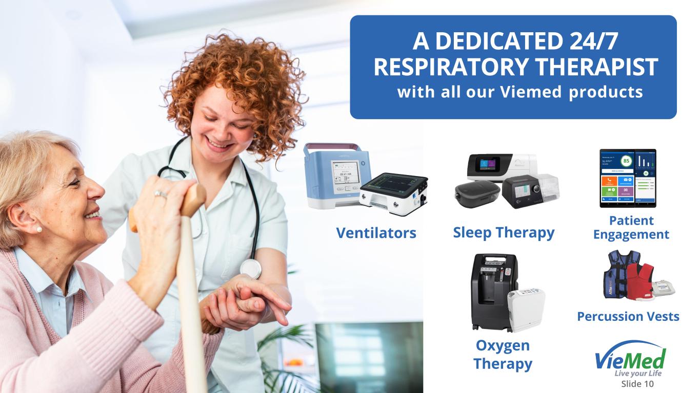 A DEDICATED 24/7 RESPIRATORY THERAPIST with all our Viemed products Ventilators Sleep Therapy Oxygen Therapy Patient Engagement Percussion Vests Slide 10