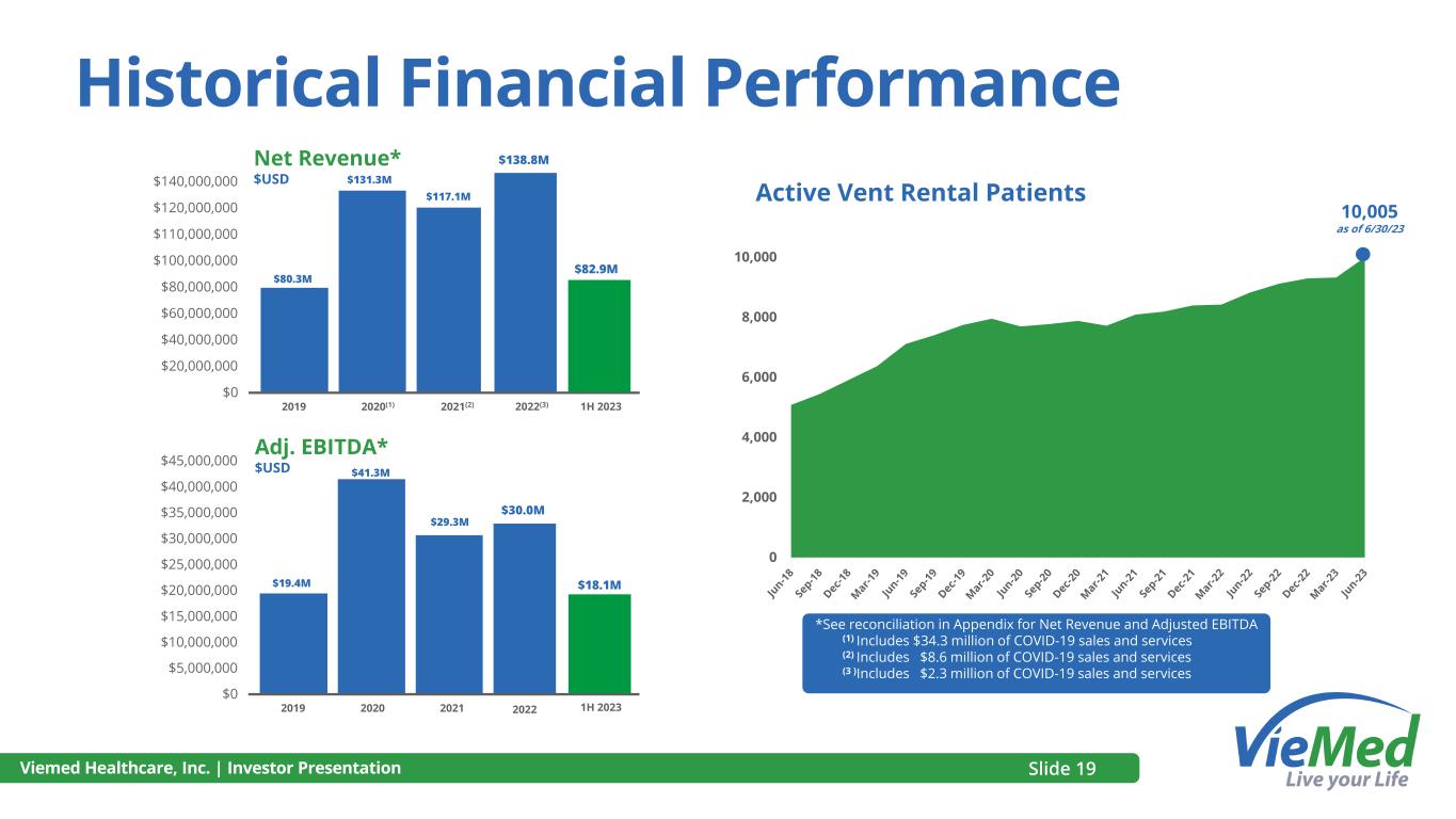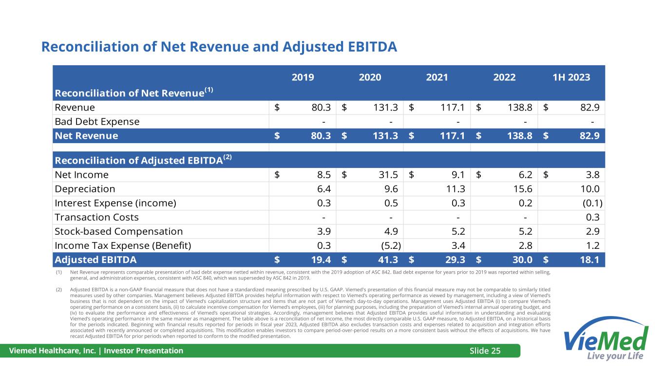 Viemed Healthcare, Inc. | Investor Presentation 2019 2020 2021 2022 1H 2023 Reconciliation of Net Revenue(1) Revenue 80.3$ 131.3$ 117.1$ 138.8$ 82.9$ Bad Debt Expense - - - - - Net Revenue 80.3$ 131.3$ 117.1$ 138.8$ 82.9$ Reconciliation of Adjusted EBITDA(2) Net Income 8.5$ 31.5$ 9.1$ 6.2$ 3.8$ Depreciation 6.4 9.6 11.3 15.6 10.0 Interest Expense (income) 0.3 0.5 0.3 0.2 (0.1) Transaction Costs - - - - 0.3 Stock-based Compensation 3.9 4.9 5.2 5.2 2.9 Income Tax Expense (Benefit) 0.3 (5.2) 3.4 2.8 1.2 Adjusted EBITDA 19.4$ 41.3$ 29.3$ 30.0$ 18.1$ (1) Net Revenue represents comparable presentation of bad debt expense netted within revenue, consistent with the 2019 adoption of ASC 842. Bad debt expense for years prior to 2019 was reported within selling, general, and administration expenses, consistent with ASC 840, which was superseded by ASC 842 in 2019. (2) Adjusted EBITDA is a non-GAAP financial measure that does not have a standardized meaning prescribed by U.S. GAAP. Viemed's presentation of this financial measure may not be comparable to similarly titled measures used by other companies. Management believes Adjusted EBITDA provides helpful information with respect to Viemed’s operating performance as viewed by management, including a view of Viemed’s business that is not dependent on the impact of Viemed’s capitalization structure and items that are not part of Viemed’s day-to-day operations. Management uses Adjusted EBITDA (i) to compare Viemed’s operating performance on a consistent basis, (ii) to calculate incentive compensation for Viemed’s employees, (iii) for planning purposes, including the preparation of Viemed’s internal annual operating budget, and (iv) to evaluate the performance and effectiveness of Viemed’s operational strategies. Accordingly, management believes that Adjusted EBITDA provides useful information in understanding and evaluating Viemed’s operating performance in the same manner as management. The table above is a reconciliation of net income, the most directly comparable U.S. GAAP measure, to Adjusted EBITDA, on a historical basis for the periods indicated. Beginning with financial results reported for periods in fiscal year 2023, Adjusted EBITDA also excludes transaction costs and expenses related to acquisition and integration efforts associated with recently announced or completed acquisitions. This modification enables investors to compare period-over-period results on a more consistent basis without the effects of acquisitions. We have recast Adjusted EBITDA for prior periods when reported to conform to the modified presentation. Reconciliation of Net Revenue and Adjusted EBITDA Slide 25