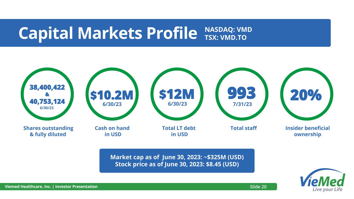 Capital Markets Profile Viemed Healthcare, Inc. | Investor Presentation 38,400,422 & 40,753,124 Shares outstanding & fully diluted $10.2M 20% Insider beneficial ownership Cash on hand in USD Total LT debt in USD $12M Total staff 993 Market cap as of June 30, 2023: ~$325M (USD) Stock price as of June 30, 2023: $8.45 (USD) NASDAQ: VMD TSX: VMD.TO 6/30/23 6/30/23 6/30/23 7/31/23 Slide 20