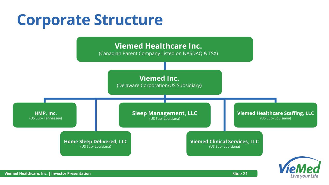 Viemed Healthcare, Inc. | Investor Presentation Corporate Structure Viemed Healthcare Inc. (Canadian Parent Company Listed on NASDAQ & TSX) Viemed Inc. (Delaware Corporation/US Subsidiary) Home Sleep Delivered, LLC (US Sub- Louisiana) Viemed Clinical Services, LLC (US Sub- Louisiana) Viemed Healthcare Staffing, LLC (US Sub- Louisiana) Slide 21 HMP, Inc. (US Sub- Tennessee) Sleep Management, LLC (US Sub- Louisiana)