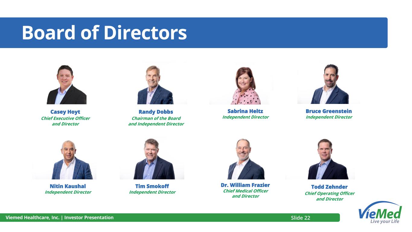 Board of Directors Viemed Healthcare, Inc. | Investor Presentation Casey Hoyt Chief Executive Officer and Director Randy Dobbs Chairman of the Board and Independent Director Todd Zehnder Chief Operating Officer and Director Nitin Kaushal Independent Director Bruce Greenstein Independent Director Tim Smokoff Independent Director Dr. William Frazier Chief Medical Officer and Director Sabrina Heltz Independent Director Slide 22