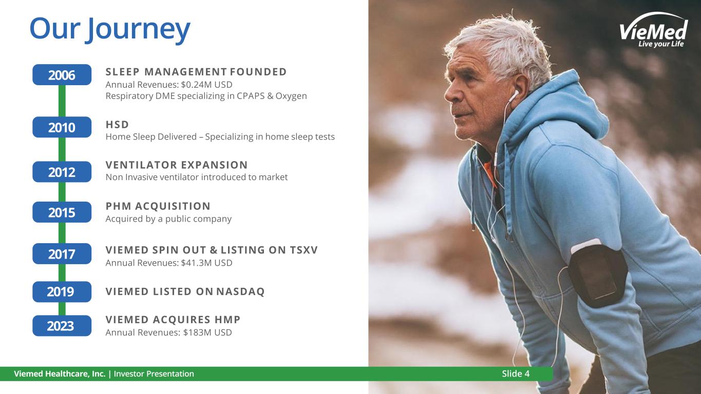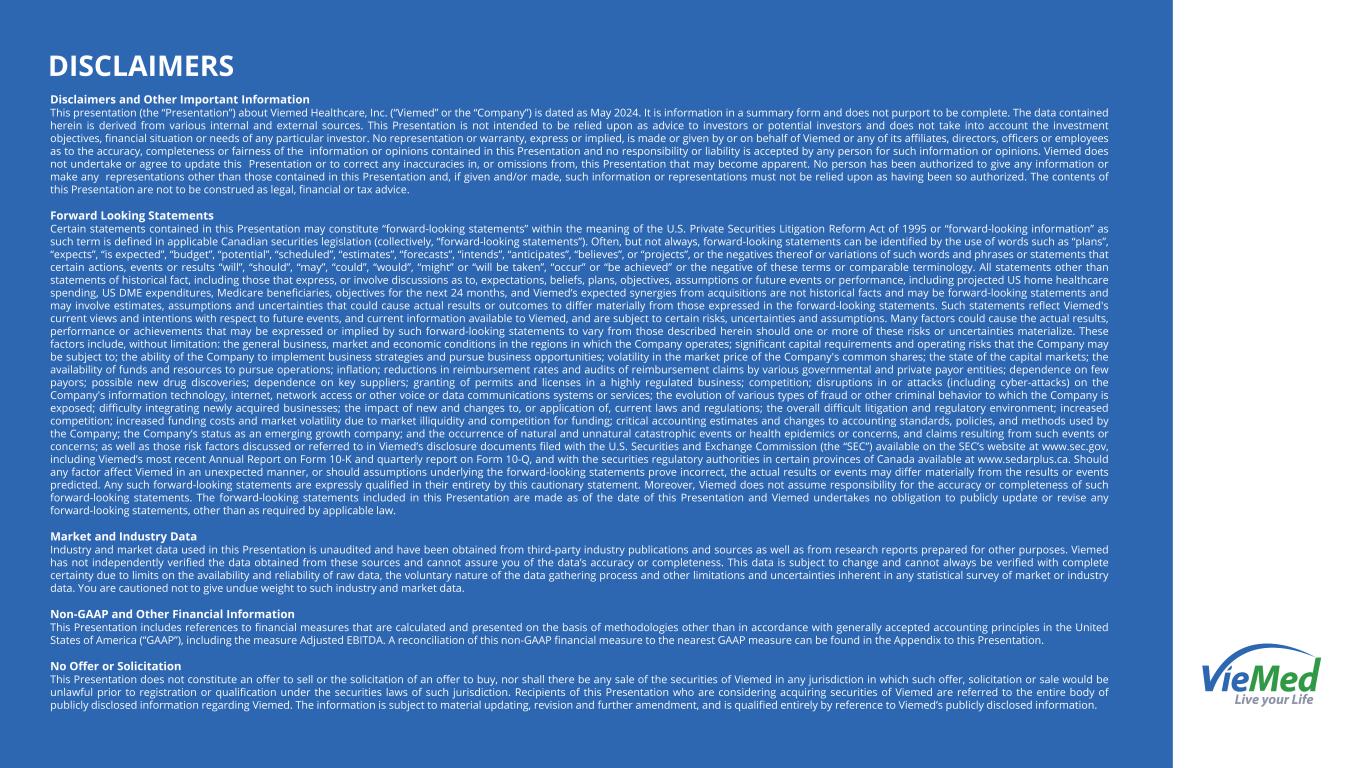 DISCLAIMERS Disclaimers and Other Important Information This presentation (the “Presentation”) about Viemed Healthcare, Inc. (“Viemed” or the “Company”) is dated as May 2024. It is information in a summary form and does not purport to be complete. The data contained herein is derived from various internal and external sources. This Presentation is not intended to be relied upon as advice to investors or potential investors and does not take into account the investment objectives, financial situation or needs of any particular investor. No representation or warranty, express or implied, is made or given by or on behalf of Viemed or any of its affiliates, directors, officers or employees as to the accuracy, completeness or fairness of the information or opinions contained in this Presentation and no responsibility or liability is accepted by any person for such information or opinions. Viemed does not undertake or agree to update this Presentation or to correct any inaccuracies in, or omissions from, this Presentation that may become apparent. No person has been authorized to give any information or make any representations other than those contained in this Presentation and, if given and/or made, such information or representations must not be relied upon as having been so authorized. The contents of this Presentation are not to be construed as legal, financial or tax advice. Forward Looking Statements Certain statements contained in this Presentation may constitute “forward-looking statements” within the meaning of the U.S. Private Securities Litigation Reform Act of 1995 or “forward-looking information” as such term is defined in applicable Canadian securities legislation (collectively, “forward-looking statements”). Often, but not always, forward-looking statements can be identified by the use of words such as “plans”, “expects”, “is expected”, “budget”, “potential”, “scheduled”, “estimates”, “forecasts”, “intends”, “anticipates”, “believes”, or “projects”, or the negatives thereof or variations of such words and phrases or statements that certain actions, events or results “will”, “should”, “may”, “could”, “would”, “might” or “will be taken”, “occur” or “be achieved” or the negative of these terms or comparable terminology. All statements other than statements of historical fact, including those that express, or involve discussions as to, expectations, beliefs, plans, objectives, assumptions or future events or performance, including projected US home healthcare spending, US DME expenditures, Medicare beneficiaries, objectives for the next 24 months, and Viemed’s expected synergies from acquisitions are not historical facts and may be forward-looking statements and may involve estimates, assumptions and uncertainties that could cause actual results or outcomes to differ materially from those expressed in the forward-looking statements. Such statements reflect Viemed's current views and intentions with respect to future events, and current information available to Viemed, and are subject to certain risks, uncertainties and assumptions. Many factors could cause the actual results, performance or achievements that may be expressed or implied by such forward-looking statements to vary from those described herein should one or more of these risks or uncertainties materialize. These factors include, without limitation: the general business, market and economic conditions in the regions in which the Company operates; significant capital requirements and operating risks that the Company may be subject to; the ability of the Company to implement business strategies and pursue business opportunities; volatility in the market price of the Company's common shares; the state of the capital markets; the availability of funds and resources to pursue operations; inflation; reductions in reimbursement rates and audits of reimbursement claims by various governmental and private payor entities; dependence on few payors; possible new drug discoveries; dependence on key suppliers; granting of permits and licenses in a highly regulated business; competition; disruptions in or attacks (including cyber-attacks) on the Company's information technology, internet, network access or other voice or data communications systems or services; the evolution of various types of fraud or other criminal behavior to which the Company is exposed; difficulty integrating newly acquired businesses; the impact of new and changes to, or application of, current laws and regulations; the overall difficult litigation and regulatory environment; increased competition; increased funding costs and market volatility due to market illiquidity and competition for funding; critical accounting estimates and changes to accounting standards, policies, and methods used by the Company; the Company’s status as an emerging growth company; and the occurrence of natural and unnatural catastrophic events or health epidemics or concerns, and claims resulting from such events or concerns; as well as those risk factors discussed or referred to in Viemed’s disclosure documents filed with the U.S. Securities and Exchange Commission (the “SEC”) available on the SEC’s website at www.sec.gov, including Viemed’s most recent Annual Report on Form 10-K and quarterly report on Form 10-Q, and with the securities regulatory authorities in certain provinces of Canada available at www.sedarplus.ca. Should any factor affect Viemed in an unexpected manner, or should assumptions underlying the forward-looking statements prove incorrect, the actual results or events may differ materially from the results or events predicted. Any such forward-looking statements are expressly qualified in their entirety by this cautionary statement. Moreover, Viemed does not assume responsibility for the accuracy or completeness of such forward-looking statements. T