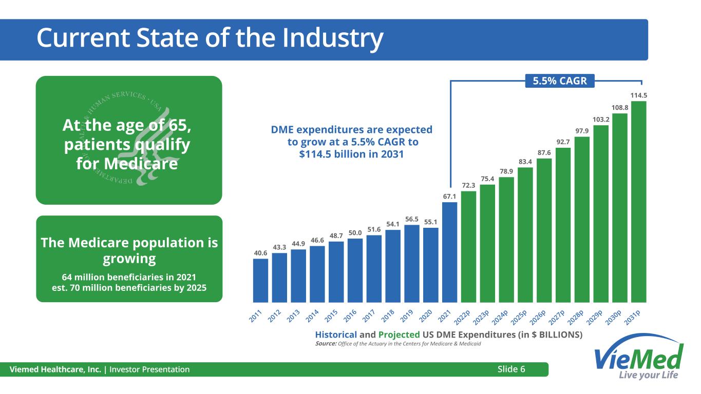 Key Investment Consideration Market Expansion in Home Medical Equipment (HME) ▪ Sustained growth in HME markets, particularly in complex respiratory and Obstructive Sleep Apnea (OSA) segments ▪ Underserved chronic COPD population qualifying for Non-Invasive Ventilation (NIV) in the home Demographic and Health Trends ▪ The aging population and rising incidence of chronic diseases contribute to patient volume growth ▪ Government and commercial payors prioritize cost-effective home care solutions over acute settings ▪ Advancements in technology and equipment empower HME providers to effectively treat complex patients at home Healthcare Economics and Competitive Landscape ▪ CMS projects a CAGR of approximately 7% for U.S. home healthcare spending, reaching $250 billion annually by 2031 ▪ COPD alone incurs $50 billion in annual healthcare costs in the U.S. Slide 5Viemed Healthcare, Inc. | Investor Presentation