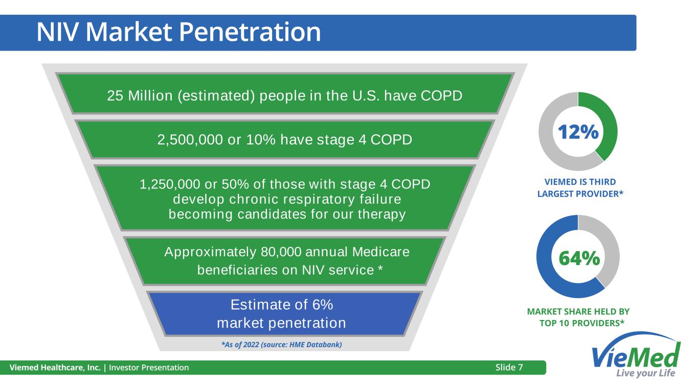 Viemed Healthcare, Inc. | Investor Presentation Current State of the Industry The Medicare population is growing DME expenditures are expected to grow at a 5.5% CAGR to $114.5 billion in 2031 5.5% CAGR At the age of 65, patients qualify for Medicare Historical and Projected US DME Expenditures (in $ BILLIONS) Source: Office of the Actuary in the Centers for Medicare & Medicaid 64 million beneficiaries in 2021 est. 70 million beneficiaries by 2025 Slide 6 40.6 43.3 44.9 46.6 48.7 50.0 51.6 54.1 56.5 55.1 67.1 72.3 75.4 78.9 83.4 87.6 92.7 97.9 103.2 108.8 114.5
