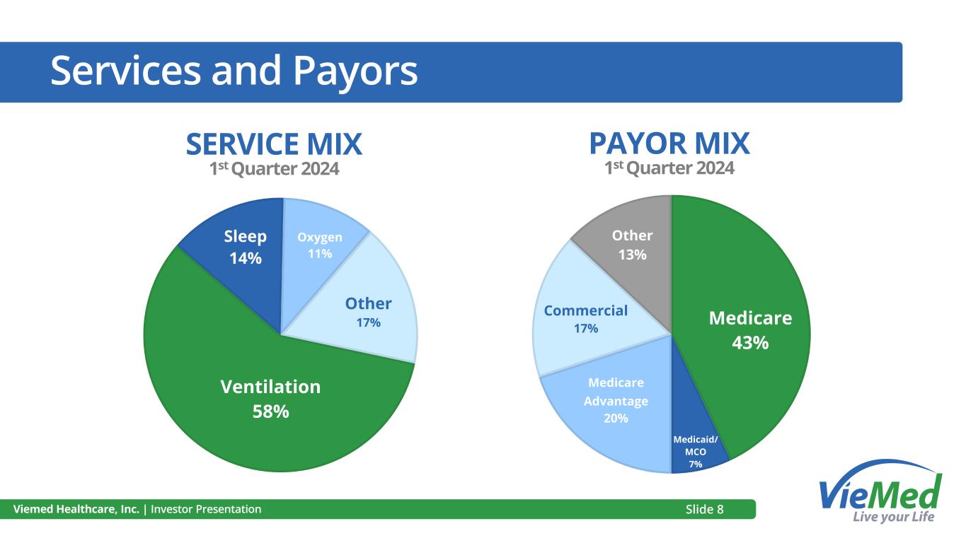 NIV Market Penetration 25 Million (estimated) people in the U.S. have COPD 2,500,000 or 10% have stage 4 COPD 1,250,000 or 50% of those with stage 4 COPD develop chronic respiratory failure becoming candidates for our therapy Approximately 80,000 annual Medicare beneficiaries on NIV service * Viemed Healthcare, Inc. | Investor Presentation Estimate of 6% market penetration *As of 2022 (source: HME Databank) 64% 12% VIEMED IS THIRD LARGEST PROVIDER* MARKET SHARE HELD BY TOP 10 PROVIDERS* Slide 7