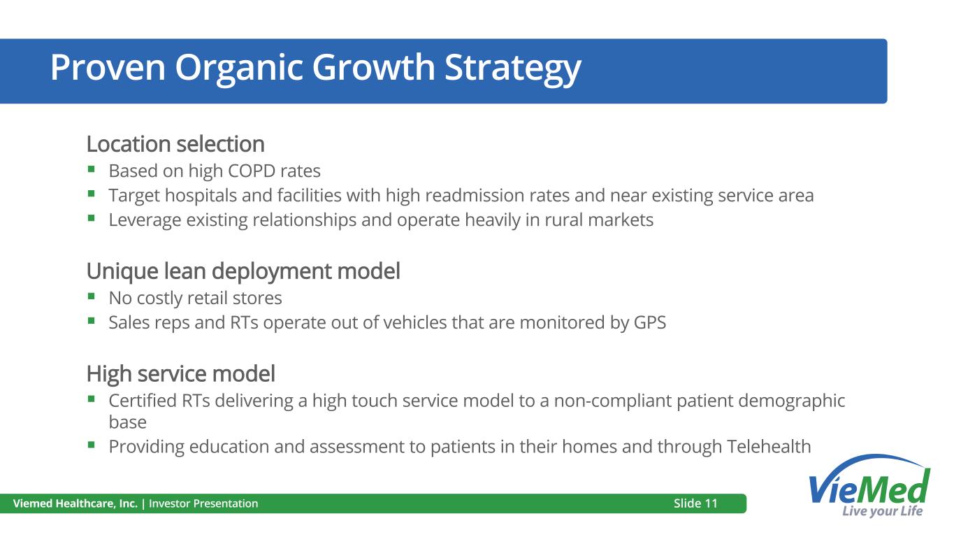 Proven Organic Growth Strategy Location selection ▪ Based on high COPD rates ▪ Target hospitals and facilities with high readmission rates and near existing service area ▪ Leverage existing relationships and operate heavily in rural markets Unique lean deployment model ▪ No costly retail stores ▪ Sales reps and RTs operate out of vehicles that are monitored by GPS High service model ▪ Certified RTs delivering a high touch service model to a non-compliant patient demographic base ▪ Providing education and assessment to patients in their homes and through Telehealth Viemed Healthcare, Inc. | Investor Presentation Slide 11