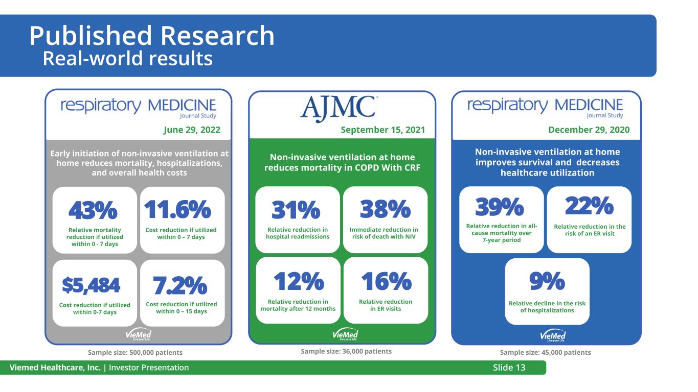 Published Research Real-world results Viemed Healthcare, Inc. | Investor Presentation 43% Relative mortality reduction if utilized within 0 - 7 days 11.6% Cost reduction if utilized within 0 – 7 days 7.2% Cost reduction if utilized within 0 – 15 days $5,484 Cost reduction if utilized within 0-7 days Early initiation of non-invasive ventilation at home reduces mortality, hospitalizations, and overall health costs 31% Relative reduction in hospital readmissions 38% Immediate reduction in risk of death with NIV 12% Relative reduction in mortality after 12 months 39% Relative reduction in all- cause mortality over 7-year period 22% 9% Relative decline in the risk of hospitalizations Non-invasive ventilation at home improves survival and decreases healthcare utilization Relative reduction in the risk of an ER visit Non-invasive ventilation at home reduces mortality in COPD With CRF September 15, 2021 December 29, 2020 June 29, 2022 Sample size: 500,000 patients Sample size: 36,000 patients Sample size: 45,000 patients 16% Relative reduction in ER visits Slide 13