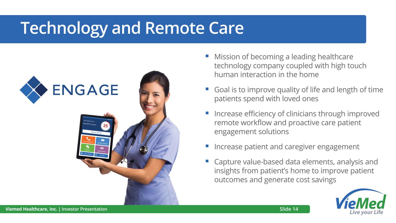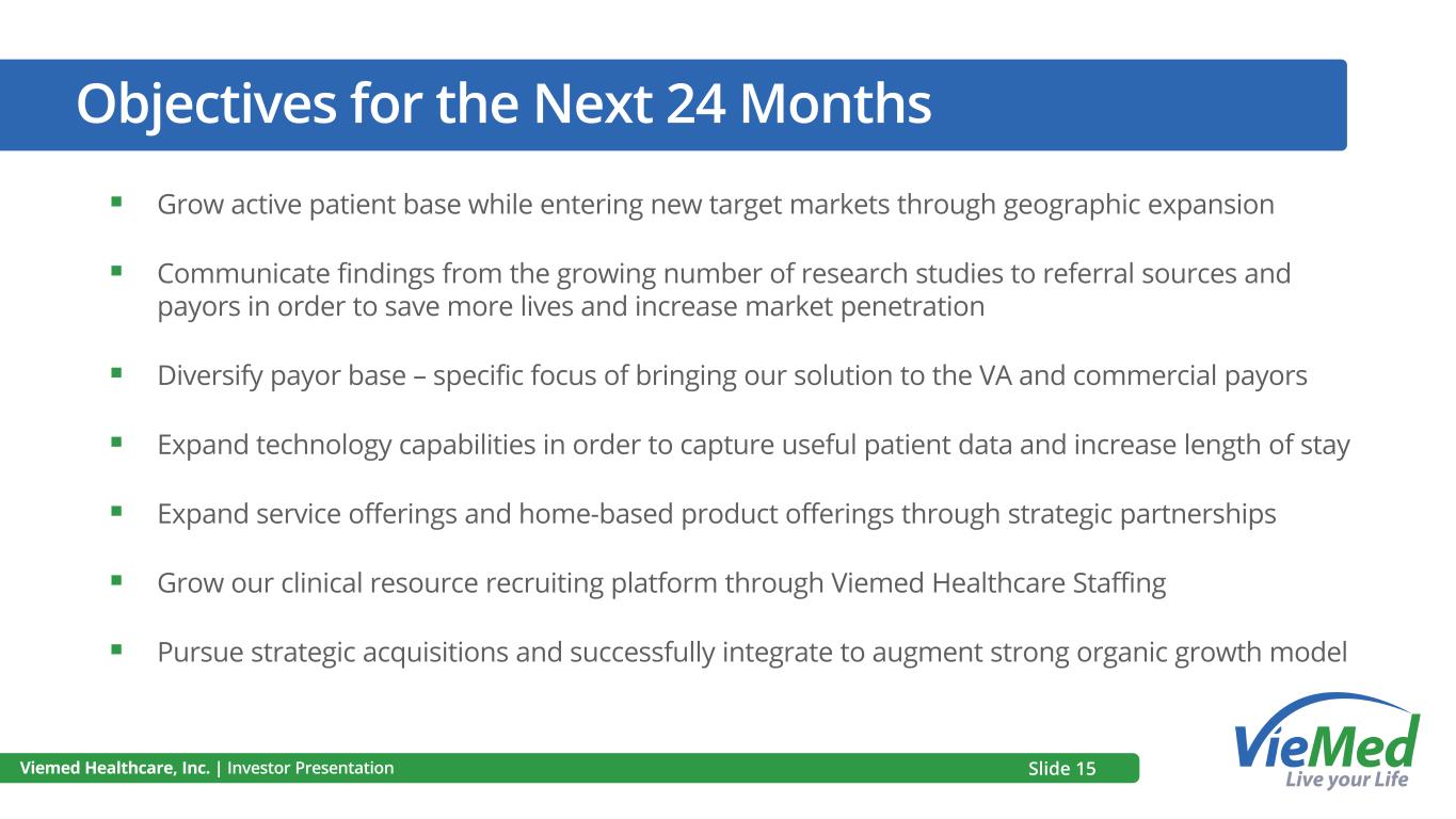 Technology and Remote Care ▪ Mission of becoming a leading healthcare technology company coupled with high touch human interaction in the home ▪ Goal is to improve quality of life and length of time patients spend with loved ones ▪ Increase efficiency of clinicians through improved remote workflow and proactive care patient engagement solutions ▪ Increase patient and caregiver engagement ▪ Capture value-based data elements, analysis and insights from patient’s home to improve patient outcomes and generate cost savings Viemed Healthcare, Inc. | Investor Presentation Slide 14