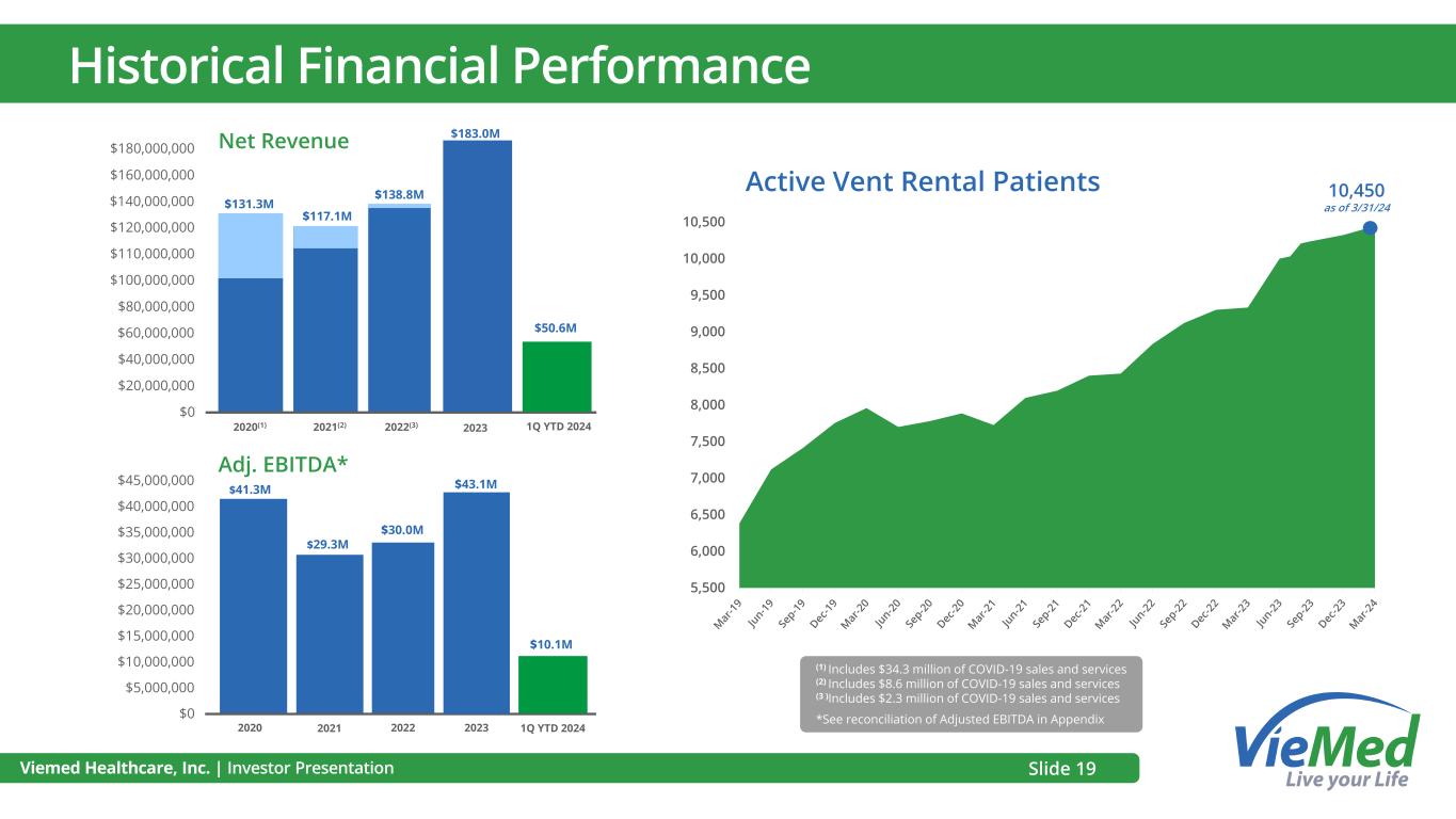 5,500 6,000 6,500 7,000 7,500 8,000 8,500 9,000 9,500 10,000 10,500 Viemed Healthcare, Inc. | Investor Presentation Historical Financial Performance Active Vent Rental Patients 10,450 as of 3/31/24 $140,000,000 $120,000,000 $110,000,000 $100,000,000 $80,000,000 $60,000,000 $40,000,000 $20,000,000 $0 2020(1) 2021(2) 2022(3) 2023 $131.3M $117.1M $138.8M $40,000,000 $35,000,000 $30,000,000 $25,000,000 $20,000,000 $15,000,000 $10,000,000 $5,000,000 $0 2020 2021 2022 2023 $41.3M $29.3M $30.0M $45,000,000 Net Revenue Adj. EBITDA* (1) Includes $34.3 million of COVID-19 sales and services (2) Includes $8.6 million of COVID-19 sales and services (3 )Includes $2.3 million of COVID-19 sales and services *See reconciliation of Adjusted EBITDA in Appendix Slide 19 1Q YTD 2024 $183.0M $43.1M 1Q YTD 2024 $160,000,000 $180,000,000 $117.1M $50.6M $10.1M