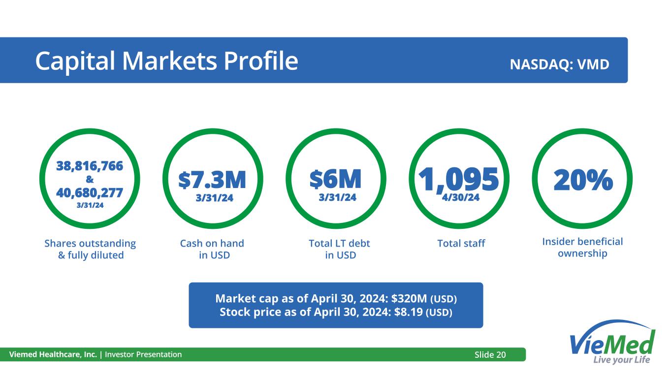Capital Markets Profile Viemed Healthcare, Inc. | Investor Presentation 38,816,766 & 40,680,277 Shares outstanding & fully diluted $7.3M 20% Insider beneficial ownership Cash on hand in USD Total LT debt in USD $6M Total staff 1,095 Market cap as of April 30, 2024: $320M (USD) Stock price as of April 30, 2024: $8.19 (USD) NASDAQ: VMD 3/31/24 3/31/24 3/31/24 4/30/24 Slide 20