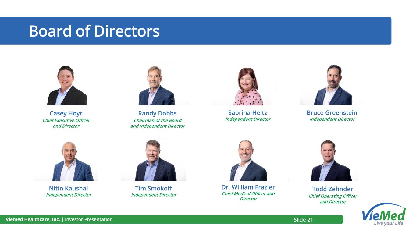 Board of Directors Viemed Healthcare, Inc. | Investor Presentation Casey Hoyt Chief Executive Officer and Director Randy Dobbs Chairman of the Board and Independent Director Todd Zehnder Chief Operating Officer and Director Nitin Kaushal Independent Director Bruce Greenstein Independent Director Tim Smokoff Independent Director Dr. William Frazier Chief Medical Officer and Director Sabrina Heltz Independent Director Slide 21