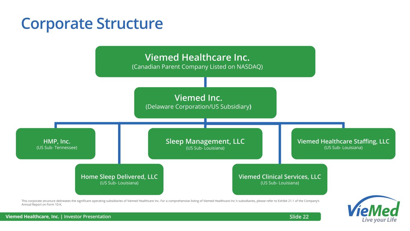 Viemed Healthcare, Inc. | Investor Presentation Corporate Structure Viemed Healthcare Inc. (Canadian Parent Company Listed on NASDAQ) Viemed Inc. (Delaware Corporation/US Subsidiary) Home Sleep Delivered, LLC (US Sub- Louisiana) Viemed Clinical Services, LLC (US Sub- Louisiana) Viemed Healthcare Staffing, LLC (US Sub- Louisiana) Slide 22 HMP, Inc. (US Sub- Tennessee) Sleep Management, LLC (US Sub- Louisiana) This corporate structure delineates the significant operating subsidiaries of Viemed Healthcare Inc. For a comprehensive listing of Viemed Healthcare Inc.’s subsidiaries, please refer to Exhibit 21.1 of the Company’s Annual Report on Form 10-K.