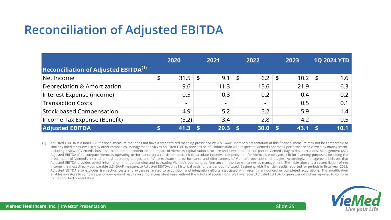 Viemed Healthcare, Inc. | Investor Presentation 2020 2021 2022 2023 1Q 2024 YTD Reconciliation of Adjusted EBITDA(1) Net Income 31.5$ 9.1$ 6.2$ 10.2$ 1.6$ Depreciation & Amortization 9.6 11.3 15.6 21.9 6.3 Interest Expense (income) 0.5 0.3 0.2 0.4 0.2 Transaction Costs - - - 0.5 0.1 Stock-based Compensation 4.9 5.2 5.2 5.9 1.4 Income Tax Expense (Benefit) (5.2) 3.4 2.8 4.2 0.5 Adjusted EBITDA 41.3$ 29.3$ 30.0$ 43.1$ 10.1$ (1) Adjusted EBITDA is a non-GAAP financial measure that does not have a standardized meaning prescribed by U.S. GAAP. Viemed's presentation of this financial measure may not be comparable to similarly titled measures used by other companies. Management believes Adjusted EBITDA provides helpful information with respect to Viemed’s operating performance as viewed by management, including a view of Viemed’s business that is not dependent on the impact of Viemed’s capitalization structure and items that are not part of Viemed’s day-to-day operations. Management uses Adjusted EBITDA (i) to compare Viemed’s operating performance on a consistent basis, (ii) to calculate incentive compensation for Viemed’s employees, (iii) for planning purposes, including the preparation of Viemed’s internal annual operating budget, and (iv) to evaluate the performance and effectiveness of Viemed’s operational strategies. Accordingly, management believes that Adjusted EBITDA provides useful information in understanding and evaluating Viemed’s operating performance in the same manner as management. The table above is a reconciliation of net income, the most directly comparable U.S. GAAP measure, to Adjusted EBITDA, on a historical basis for the periods indicated. Beginning with financial results reported for periods in fiscal year 2023, Adjusted EBITDA also excludes transaction costs and expenses related to acquisition and integration efforts associated with recently announced or completed acquisitions. This modification enables investors to compare period-over-period results on a more consistent basis without the effects of acquisitions. We have recast Adjusted EBITDA for prior periods when reported to conform to the modified presentation. Reconciliation of Adjusted EBITDA Slide 25