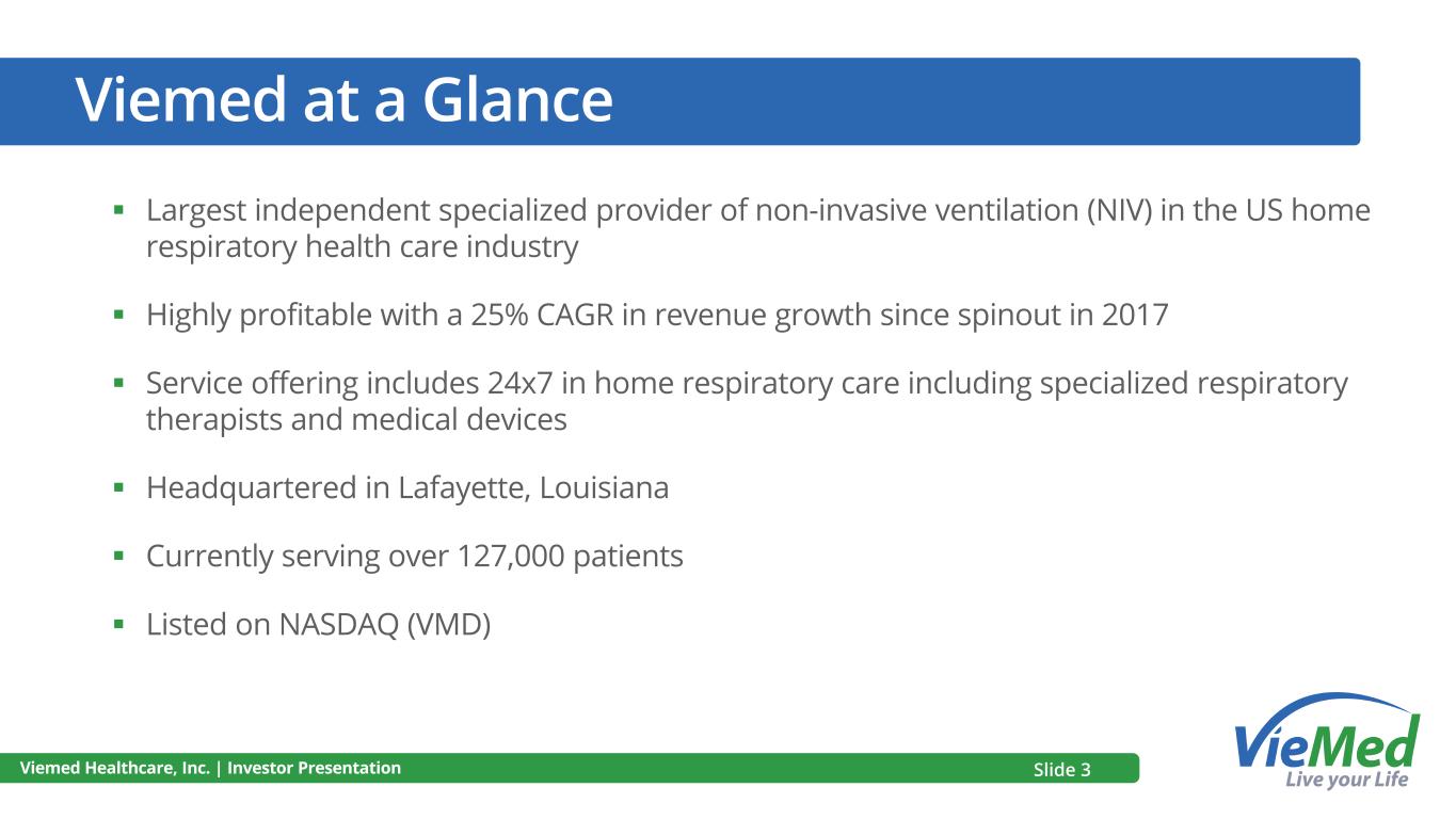 DISCLAIMERS Disclaimers and Other Important Information This presentation (the “Presentation”) about Viemed Healthcare, Inc. (“Viemed” or the “Company”) is dated as August 2024. It is information in a summary form and does not purport to be complete. The data contained herein is derived from various internal and external sources. This Presentation is not intended to be relied upon as advice to investors or potential investors and does not take into account the investment objectives, financial situation or needs of any particular investor. No representation or warranty, express or implied, is made or given by or on behalf of Viemed or any of its affiliates, directors, officers or employees as to the accuracy, completeness or fairness of the information or opinions contained in this Presentation and no responsibility or liability is accepted by any person for such information or opinions. Viemed does not undertake or agree to update this Presentation or to correct any inaccuracies in, or omissions from, this Presentation that may become apparent. No person has been authorized to give any information or make any representations other than those contained in this Presentation and, if given and/or made, such information or representations must not be relied upon as having been so authorized. The contents of this Presentation are not to be construed as legal, financial or tax advice. Forward Looking Statements Certain statements contained in this Presentation may constitute “forward-looking statements” within the meaning of the U.S. Private Securities Litigation Reform Act of 1995 or “forward-looking information” as such term is defined in applicable Canadian securities legislation (collectively, “forward-looking statements”). Often, but not always, forward-looking statements can be identified by the use of words such as “plans”, “expects”, “is expected”, “budget”, “potential”, “scheduled”, “estimates”, “forecasts”, “intends”, “anticipates”, “believes”, or “projects”, or the negatives thereof or variations of such words and phrases or statements that certain actions, events or results “will”, “should”, “may”, “could”, “would”, “might” or “will be taken”, “occur” or “be achieved” or the negative of these terms or comparable terminology. All statements other than statements of historical fact, including those that express, or involve discussions as to, expectations, beliefs, plans, objectives, assumptions or future events or performance, including projected US home healthcare spending, US DME expenditures, Medicare beneficiaries, objectives for the next 24 months, and Viemed’s expected synergies from acquisitions are not historical facts and may be forward-looking statements and may involve estimates, assumptions and uncertainties that could cause actual results or outcomes to differ materially from those expressed in the forward-looking statements. Such statements reflect Viemed's current views and intentions with respect to future events, and current information available to Viemed, and are subject to certain risks, uncertainties and assumptions. Many factors could cause the actual results, performance or achievements that may be expressed or implied by such forward-looking statements to vary from those described herein should one or more of these risks or uncertainties materialize. These factors include, without limitation: the general business, market and economic conditions in the regions in which the Company operates; significant capital requirements and operating risks that the Company may be subject to; the ability of the Company to implement business strategies and pursue business opportunities; volatility in the market price of the Company's common shares; the state of the capital markets; the availability of funds and resources to pursue operations; inflation; reductions in reimbursement rates and audits of reimbursement claims by various governmental and private payor entities; dependence on few payors; possible new drug discoveries; dependence on key suppliers; granting of permits and licenses in a highly regulated business; competition; disruptions in or attacks (including cyber-attacks) on the Company's information technology, internet, network access or other voice or data communications systems or services; the evolution of various types of fraud or other criminal behavior to which the Company is exposed; difficulty integrating newly acquired businesses; the impact of new and changes to, or application of, current laws and regulations; the overall difficult litigation and regulatory environment; increased competition; increased funding costs and market volatility due to market illiquidity and competition for funding; critical accounting estimates and changes to accounting standards, policies, and methods used by the Company; the Company’s status as an emerging growth company; and the occurrence of natural and unnatural catastrophic events or health epidemics or concerns, and claims resulting from such events or concerns; as well as those risk factors discussed or referred to in Viemed’s disclosure documents filed with the U.S. Securities and Exchange Commission (the “SEC”) available on the SEC’s website at www.sec.gov, including Viemed’s most recent Annual Report on Form 10-K and quarterly report on Form 10-Q, and with the securities regulatory authorities in certain provinces of Canada available at www.sedarplus.ca. Should any factor affect Viemed in an unexpected manner, or should assumptions underlying the forward-looking statements prove incorrect, the actual results or events may differ materially from the results or events predicted. Any such forward-looking statements are expressly qualified in their entirety by this cautionary statement. Moreover, Viemed does not assume responsibility for the accuracy or completeness of such forward-looking statements