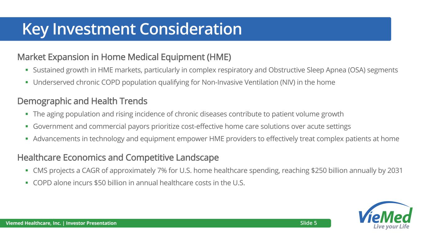SLEEP MANAGEMENT FOUNDED Annual Revenues: $0.24M USD Respiratory DME specializing in CPAPS & Oxygen HSD Home Sleep Delivered – Specializing in home sleep tests VENTILATOR EXPANSION Non Invasive ventilator introduced to market PHM ACQUISITION Acquired by a public company VIEMED SPIN OUT & LISTING ON TSXV Annual Revenues: $41.3M USD VIEMED LISTED ON NASDAQ VIEMED ACQUIRES HMP Annual Revenues: $183M USD Our Journey 2010 2012 2015 2017 2019 2023 2006 Viemed Healthcare, Inc. | Investor Presentation Slide 4