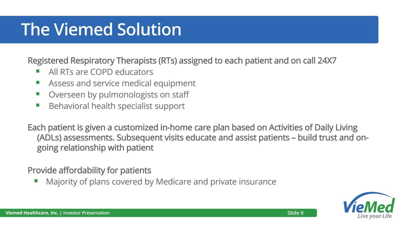 Services and Payors Viemed Healthcare, Inc. | Investor Presentation Ventilation 56% Sleep 16% Oxygen 10% Other 18% Medicare 42% Medicaid/ MCO 8% Medicare Advantage 20% Commercial 19% Other 11% SERVICE MIX 2nd Quarter 2024 PAYOR MIX 2nd Quarter 2024 Slide 8