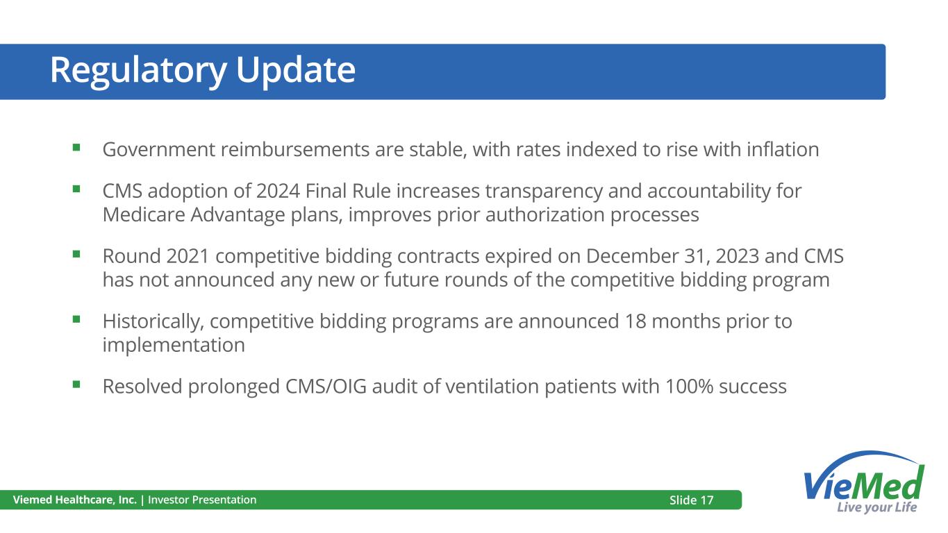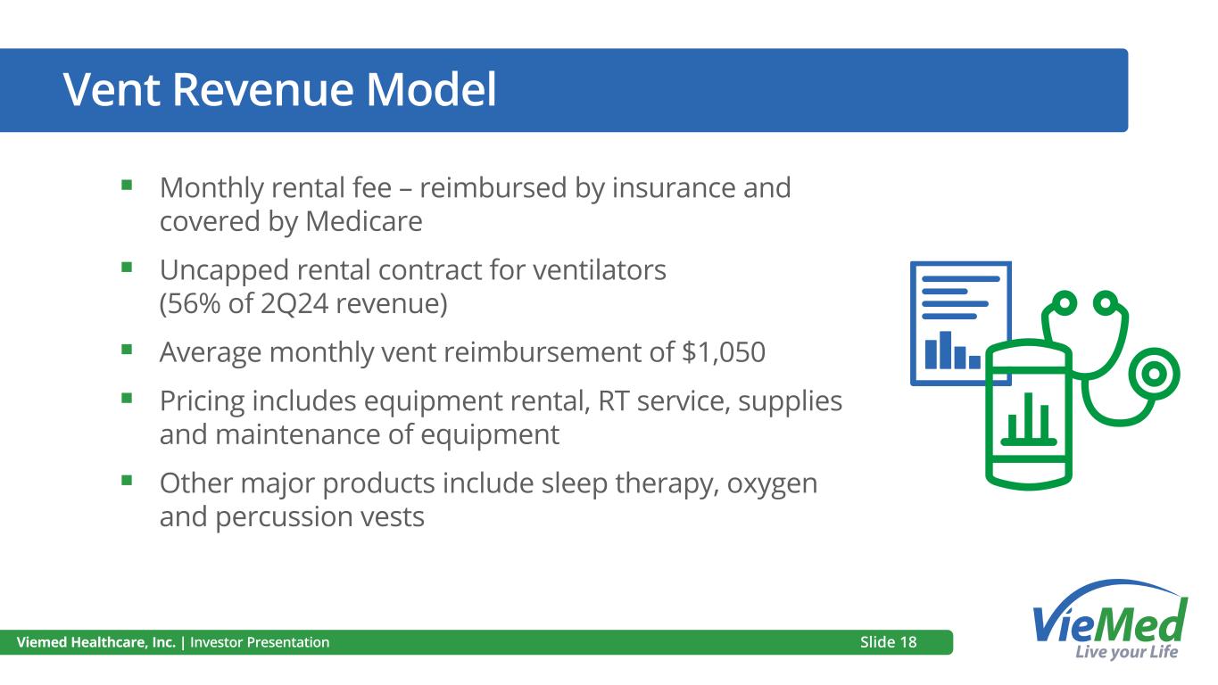 Regulatory Update ▪ Government reimbursements are stable, with rates indexed to rise with inflation ▪ CMS adoption of 2024 Final Rule increases transparency and accountability for Medicare Advantage plans, improves prior authorization processes ▪ Round 2021 competitive bidding contracts expired on December 31, 2023 and CMS has not announced any new or future rounds of the competitive bidding program ▪ Historically, competitive bidding programs are announced 18 months prior to implementation ▪ Resolved prolonged CMS/OIG audit of ventilation patients with 100% success Viemed Healthcare, Inc. | Investor Presentation Slide 17