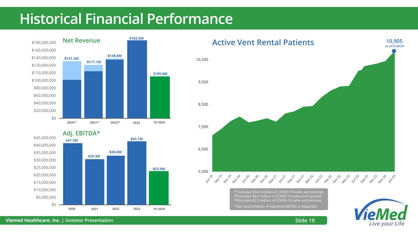 5,500 6,500 7,500 8,500 9,500 10,500 Viemed Healthcare, Inc. | Investor Presentation Historical Financial Performance Active Vent Rental Patients 10,905 as of 6/30/24 $140,000,000 $120,000,000 $110,000,000 $100,000,000 $80,000,000 $60,000,000 $40,000,000 $20,000,000 $0 2020(1) 2021(2) 2022(3) 2023 $131.3M $117.1M $138.8M $40,000,000 $35,000,000 $30,000,000 $25,000,000 $20,000,000 $15,000,000 $10,000,000 $5,000,000 $0 2020 2021 2022 2023 $41.3M $29.3M $30.0M $45,000,000 Net Revenue Adj. EBITDA* (1) Includes $34.3 million of COVID-19 sales and services (2) Includes $8.6 million of COVID-19 sales and services (3 )Includes $2.3 million of COVID-19 sales and services *See reconciliation of Adjusted EBITDA in Appendix Slide 19 1H 2024 $183.0M $43.1M 1H 2024 $160,000,000 $180,000,000 $117.1M $105.6M $22.9M
