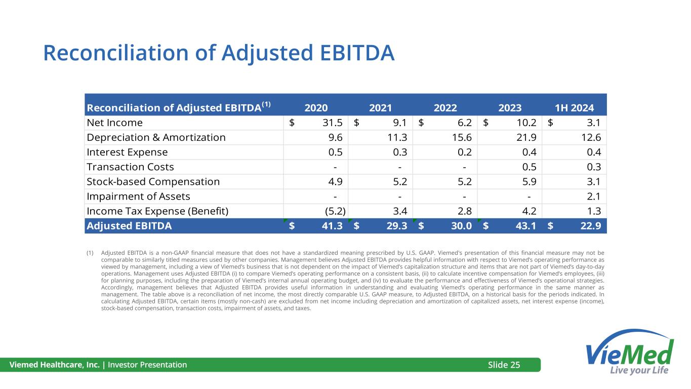 Viemed Healthcare, Inc. | Investor Presentation Reconciliation of Adjusted EBITDA(1) 2020 2021 2022 2023 1H 2024 Net Income 31.5$ 9.1$ 6.2$ 10.2$ 3.1$ Depreciation & Amortization 9.6 11.3 15.6 21.9 12.6 Interest Expense 0.5 0.3 0.2 0.4 0.4 Transaction Costs - - - 0.5 0.3 Stock-based Compensation 4.9 5.2 5.2 5.9 3.1 Impairment of Assets - - - - 2.1 Income Tax Expense (Benefit) (5.2) 3.4 2.8 4.2 1.3 Adjusted EBITDA 41.3$ 29.3$ 30.0$ 43.1$ 22.9$ (1) Adjusted EBITDA is a non-GAAP financial measure that does not have a standardized meaning prescribed by U.S. GAAP. Viemed's presentation of this financial measure may not be comparable to similarly titled measures used by other companies. Management believes Adjusted EBITDA provides helpful information with respect to Viemed’s operating performance as viewed by management, including a view of Viemed’s business that is not dependent on the impact of Viemed’s capitalization structure and items that are not part of Viemed’s day-to-day operations. Management uses Adjusted EBITDA (i) to compare Viemed’s operating performance on a consistent basis, (ii) to calculate incentive compensation for Viemed’s employees, (iii) for planning purposes, including the preparation of Viemed’s internal annual operating budget, and (iv) to evaluate the performance and effectiveness of Viemed’s operational strategies. Accordingly, management believes that Adjusted EBITDA provides useful information in understanding and evaluating Viemed’s operating performance in the same manner as management. The table above is a reconciliation of net income, the most directly comparable U.S. GAAP measure, to Adjusted EBITDA, on a historical basis for the periods indicated. In calculating Adjusted EBITDA, certain items (mostly non-cash) are excluded from net income including depreciation and amortization of capitalized assets, net interest expense (income), stock-based compensation, transaction costs, impairment of assets, and taxes. Reconciliation of Adjusted EBITDA Slide 25